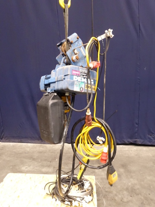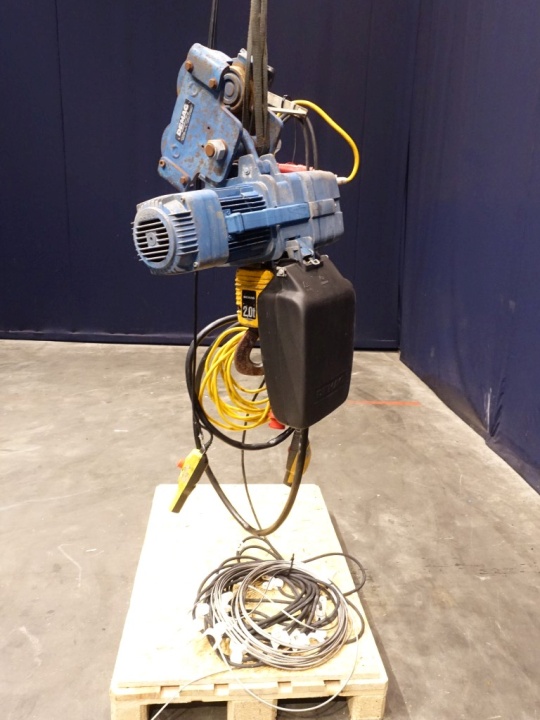 Crane previous used for lifting out the bowl of a separator. Max lifiting capacity 2.000 kg. Including push trolley. Motor power: 0,42 kW - 2,5 A - 2800 rpm.