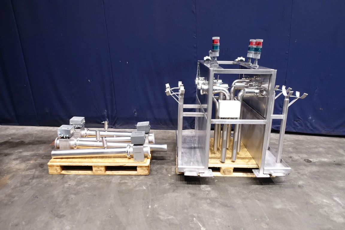 4 Reception units for truck unloading by gravity. 4 Flow transmitter Diesel (total count send to scada system), 1 panel for reception units with start/stop button for driver. Emptying of trucks with Raw milk by Free fall to the basement by gravity to lower placed tanks, capacity depending on the connection (outlet size) on the truck. Total dimensions of reception unit: 130 x 160 x 150 cm.