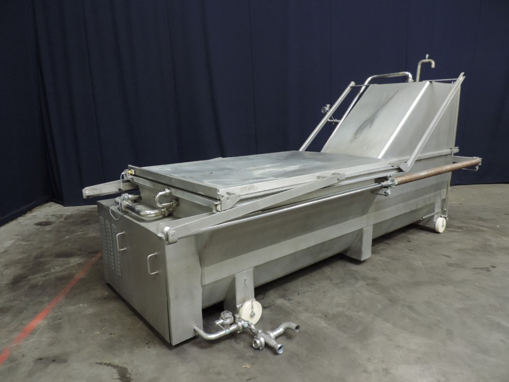 Closed stainless steel butter silo with pneumatic cover. 2 Augers. 1 Motor with reductor. CIP cleanable with spray bowls in silo and at outfeed augers. 4" DIN outfeed for butter pump. Inside measurements of silo: ± 4,0 x 1,0 x 0,9 meter. Includng butter pump, Egli, EBP53 112-147-K, motor: 4 kW - 8,8 A -1420 rpm with variable speed gearbox and CIP return pump, APV, PUMA. Excluding control panel. Total dimensions: 6,0 x 2,0 x 2,5 meter. The butter shredder, STN12639 was standing above the silo, for entering slivers of butter.