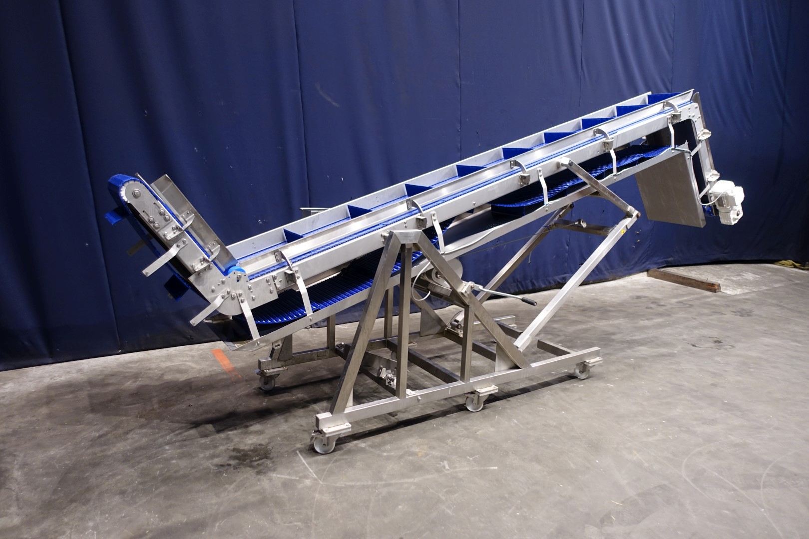 Mobile elevating belt with dividers. Elevating height adjustable through manual hoist. Built on stainless steel frame. Plastic mesh belt. Belt width: 380 mm. Distance between dividers: 385 mm. Divider height: 75 mm. Elevating height: 1800 mm. Total dimensions: 440x105x255 cm (lxwxh) - weight: 305 kg.