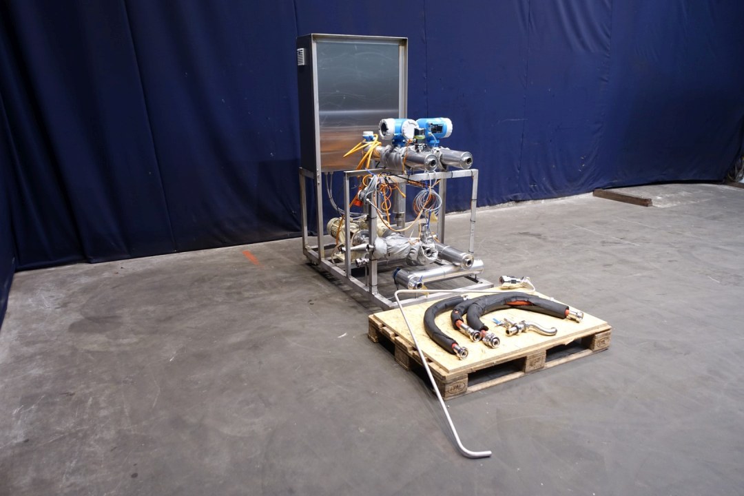 Unit to pump and measure and registrate 2 flows - temperatures and pressures between approx 500 and 5,000ltr/h. Complete mounted on mobile ss frame. With 2 x Fristam model: FP 712 centrifugal pumps, 2x E&H Promag 53 flowmeters. Control panel to regulate flow control in and out, pump control in percentage. With 3 x E&H temperature transmitters, 1 x pressure transmitter and 1 x E&H Ecograph T RSG35. 2 x Danfoss frequency convertors for the 2 x Fristam pumps. Connections: 10x 1" Din. Total dimensions: 150x85x185 (lxwxh) cm - weight 296 kg's.