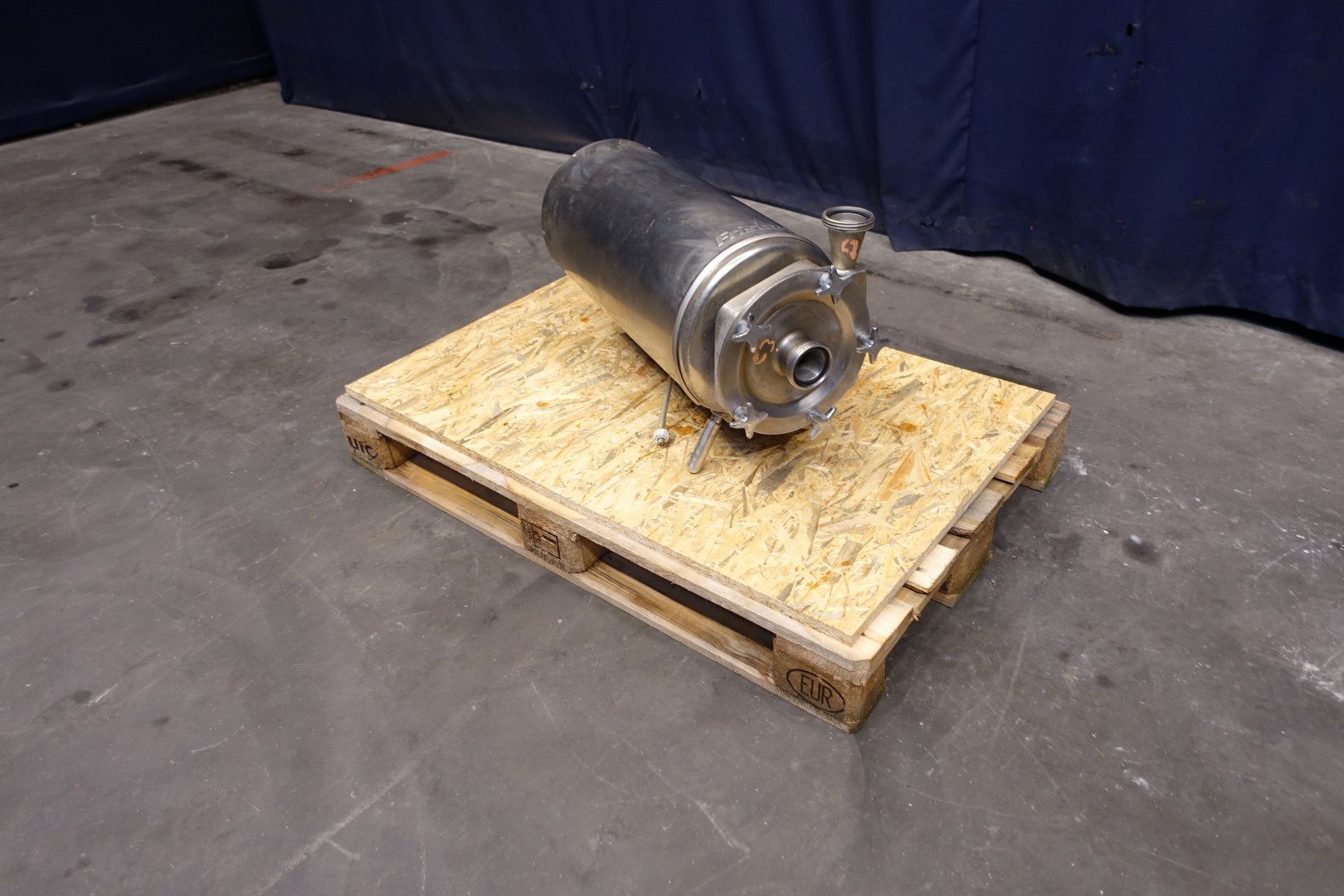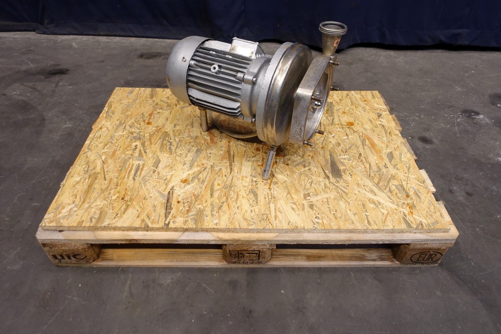 Sanitary centrifugal pump. motor: 5,5 kW - 12,5 A - 2.900 rpm - 50 Hz. Impellor diameter: 175 mm. Approx 4 bar. Connections: (in) 2" Din / (out) 2" Din. Total dimensions: 71x30x42 (lxwxh) cm.