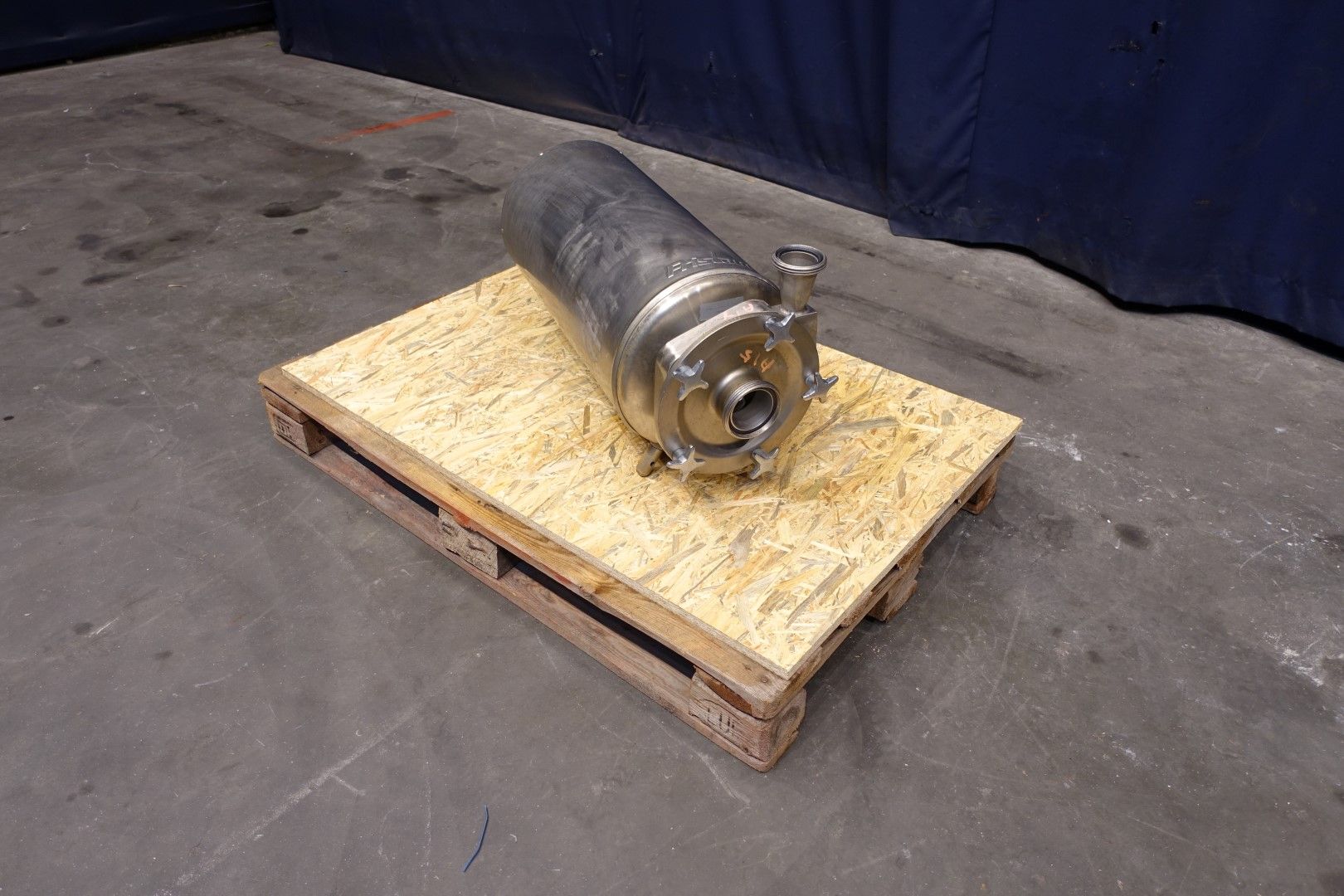 Sanitary centrifugal pump. Motor: 5,5 kW - 12,0 A - 2.890 rpm - 50 Hz. Impellor diameter: 195 mm, approx 5 bar. Connections: (in) 2,5" Din / (out) 2" Din. Total dimensions: 73x30x38 (lxwxh) cm.