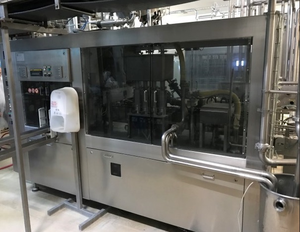 Automatic carton filling machine designed for the inline forming, filling and sealing of gable top cartons, standard cartons 70 x 70 mm. 250-1.000 ml B style, 4 head piston filler, CIP cleanable, cap applicator model SCA machine nr.: 002SCA05 for standard 22 mm, (Portula) spouts, Dukane ultrasonic welder, electrical top and bottom heating, foam suction device and outfeed conveyor. Controls: PLC Fanuc. Including caps bunker for cap buffer.