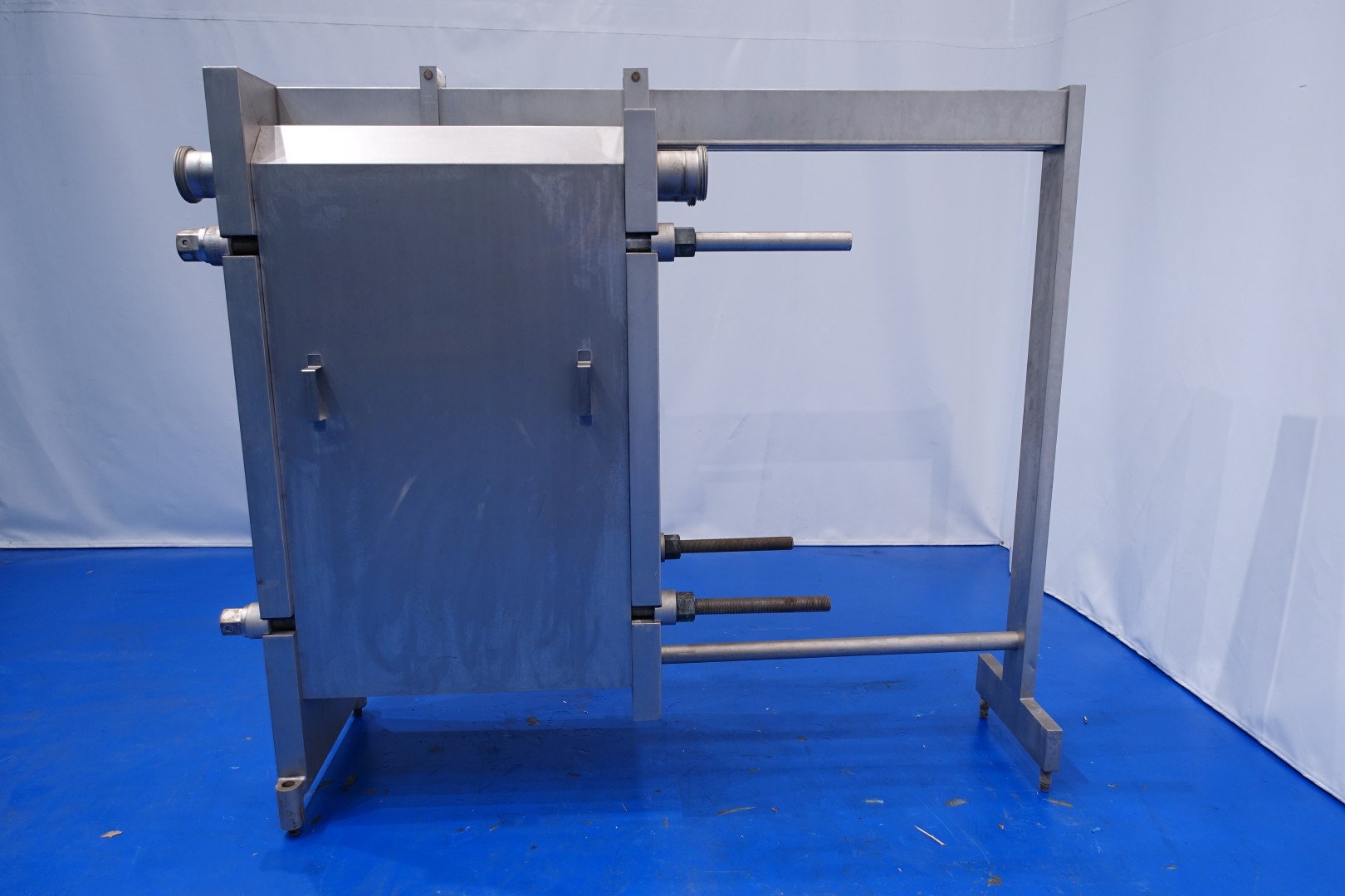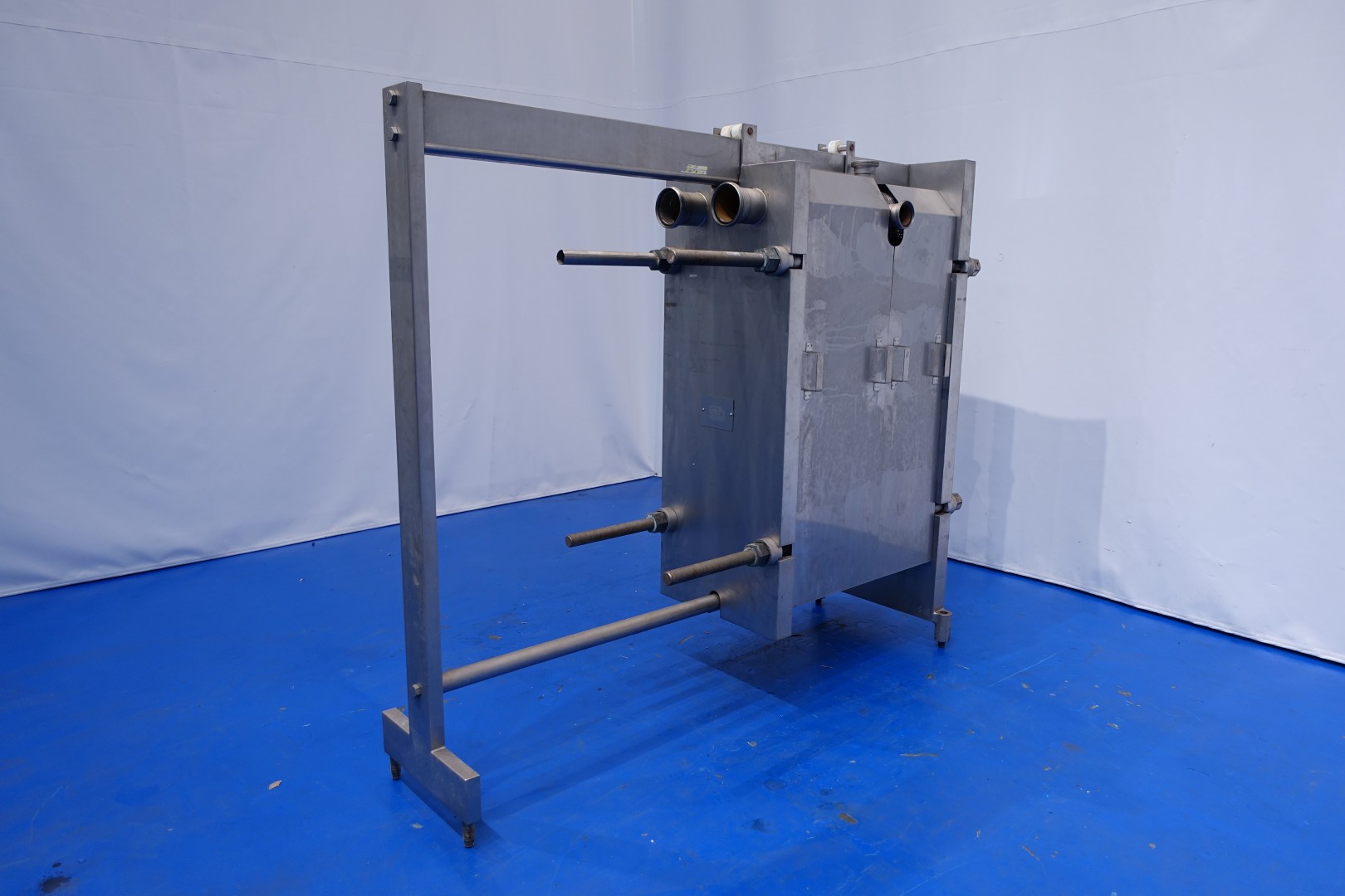Plate heat exchanger, sanitary (PHE). Max working pressure: 10 bar - Max working temperature: 100 °C. Beam length: 194 cm, connections: 4x DN100 Din - 2 x DN65 Din. Current configuration: 2 Sections: 73-87 plates (total 160) - Connections head: 2 up, follower 2 up. Total volume: 2x 170,5ltr each section. Used as quark cooler 5,000ltr/h from 43->4°C in 2 steps. But other Flow- temperature cycles possible. Total dimensions: 217x70x187 (lxwxh) cm - weight: 2.139 kg.