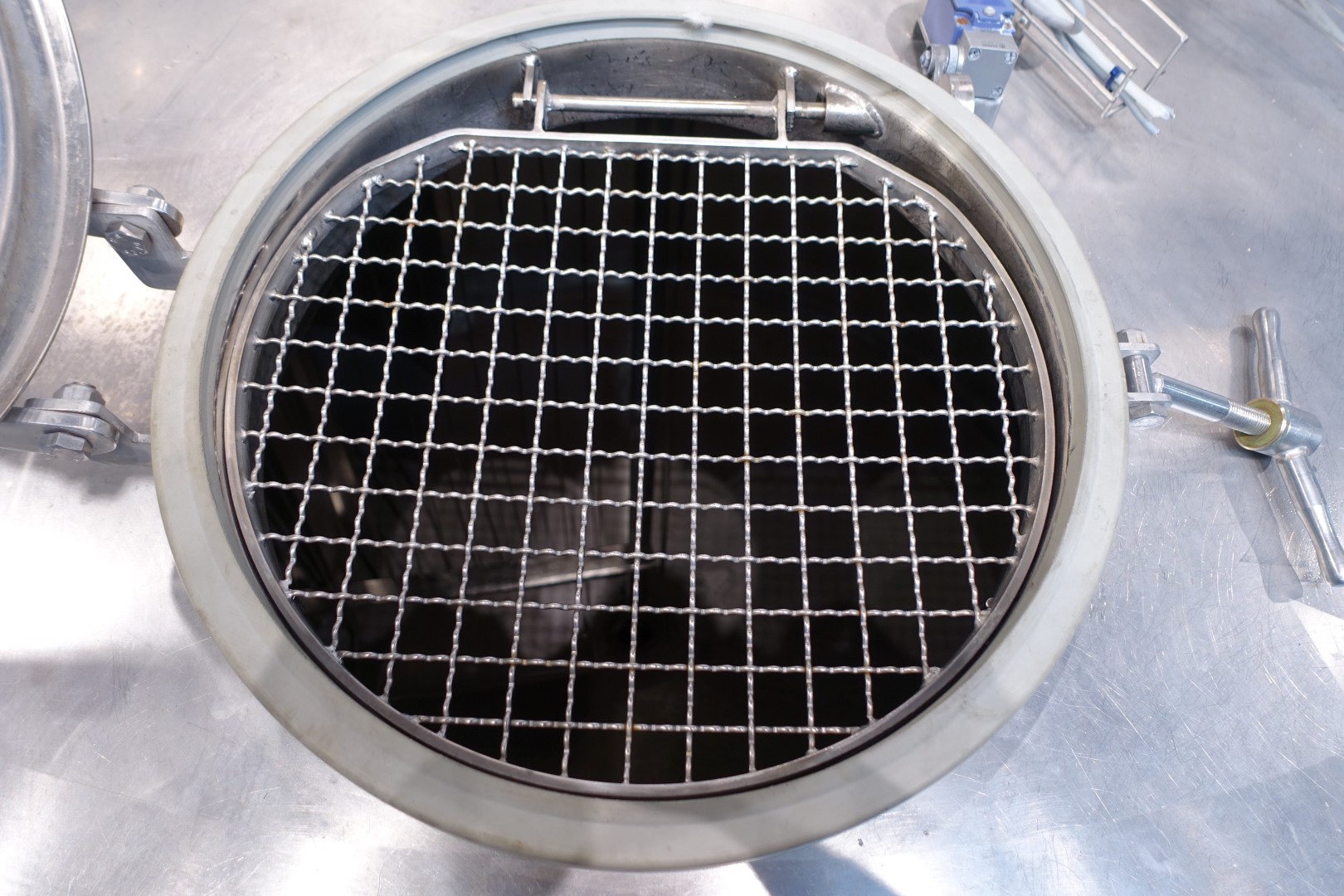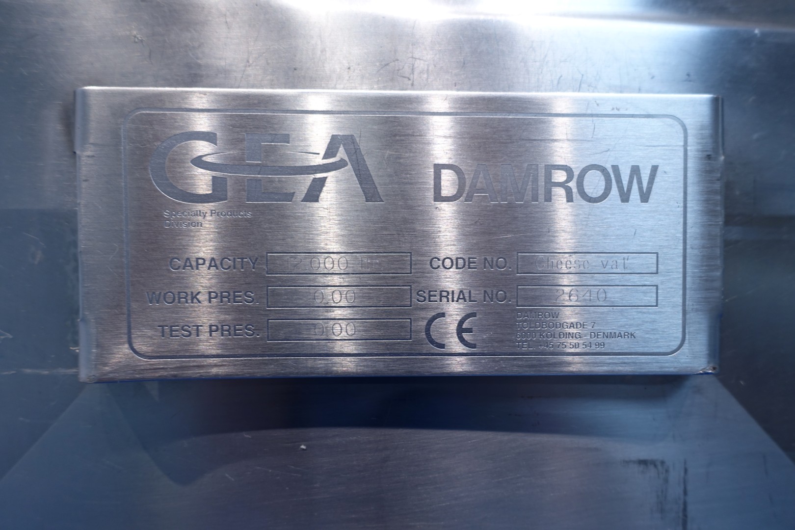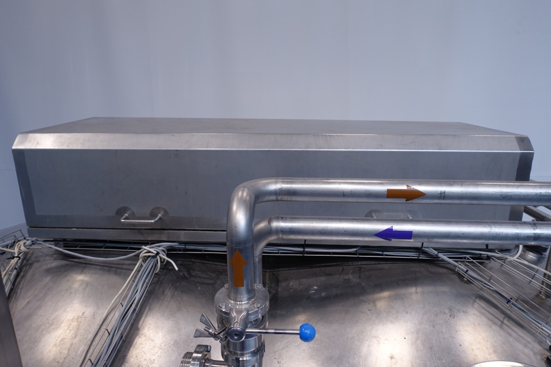 Horizontal curd making vat. Double-O DB. Double jacketed. Whey suction device from the top with sensors. Manhole round 45 cm with safety guard with sensor. Higher placed legs (currently cut for transport). Drive motor 4,0 kW. CIP cleanable, equipped with two spray bowls. Breather on top with cip bowl, cip pipe with manual butterfly valve. Inspection lamp in top. Outlet (cheese curd) height (with legs) ca 35 cm, pipe diameter ca. 100mm. New controls and auxilieries can be offered on request. Operation manual and electrical diagram (in German) available. Total dimensions: 395x260x335 (lxwxh) cm - weight: 2.870 kg