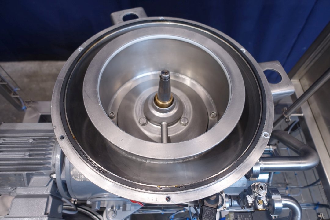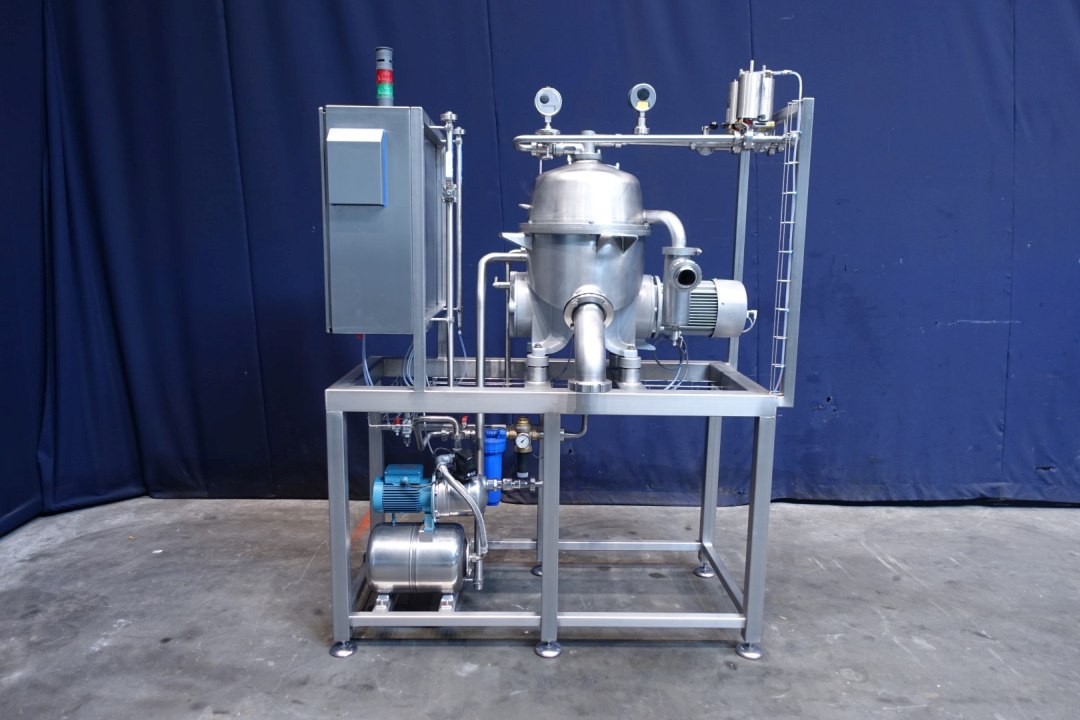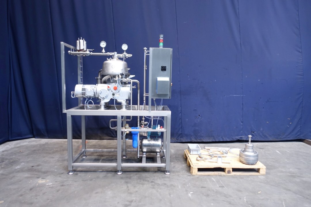 Reconditioned Water - Fat separator with single centripetal pump for heavy phase (like water/skimmilk) with self-cleaning bowl. The separator is used for separating liquid mixtures in which the proportion of light phase (for instance fatt/rest butter) is small (below 10%) or varies widely. The heavy phase is pumped out under pressure, the light fase leaves the machine by gravity through the bottom outlet. Bowl speed 9.210 rpm. Motor details: 4 kW. Ø Di in mm 271. Bowl speed: 9.210 rpm. Heavy liquids: 1,0. Solid: 1,15. by-pass product valves. Sludge collecting tank. Fully rebuild, mounted on a stainles steel frame. New control box with PLC Siemens S7-1200 and Touch Screen control panel with all messages and settings. ampère indicator motor, hour counter, frequency converter, cabling, pressure transmitters readout. Water valves for manouvering water to open and close the bowl with water reducers and constant water pressure module. Waterfilters and spare filters. Set of tools, manuals and electric scheme.
