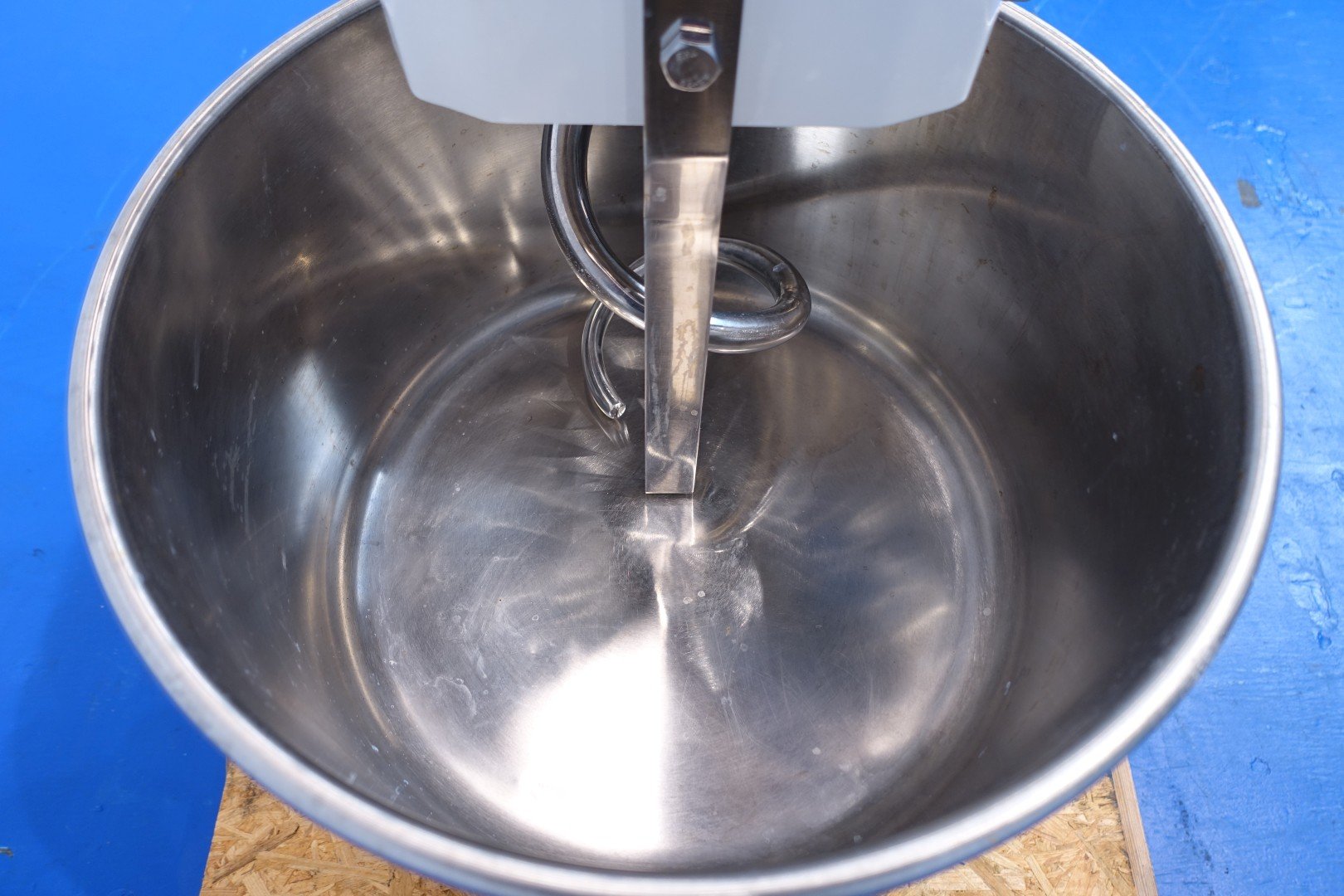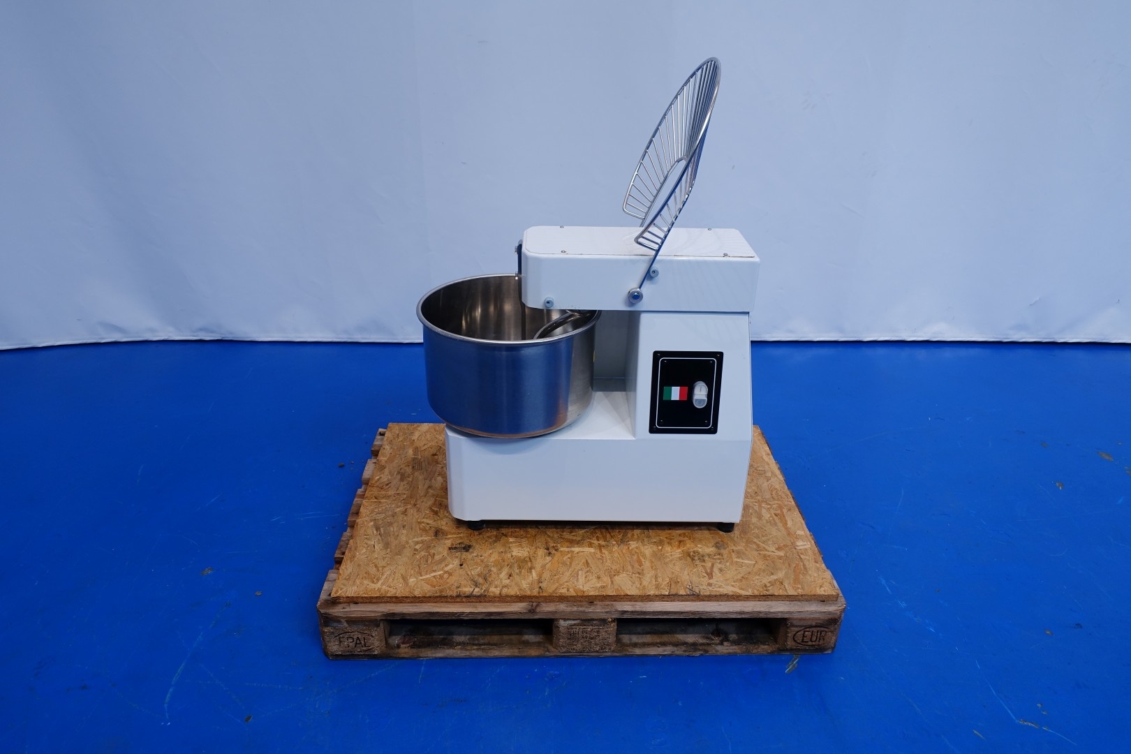 Dough kneading machine with fixed SS bowl. In working condition. Max content 18 kg flower or 22 liters. With safety sensor on top fence. Dimensions: 79x43x72 (lxwxh) cm - 130 kg.