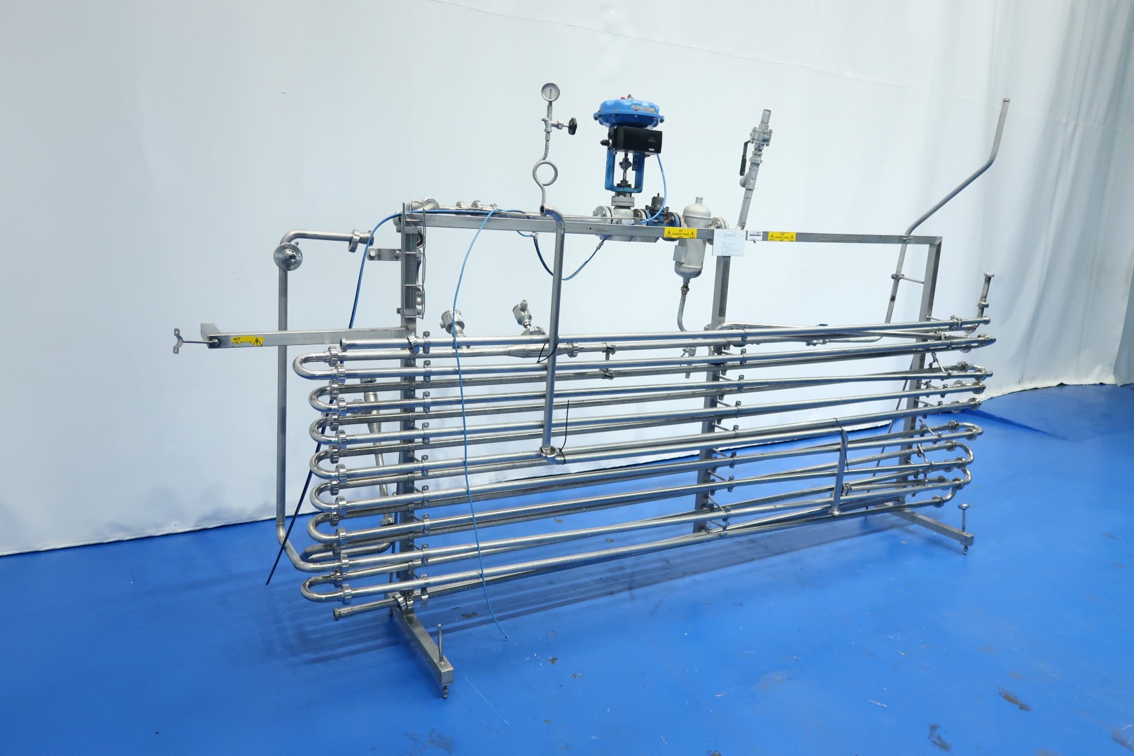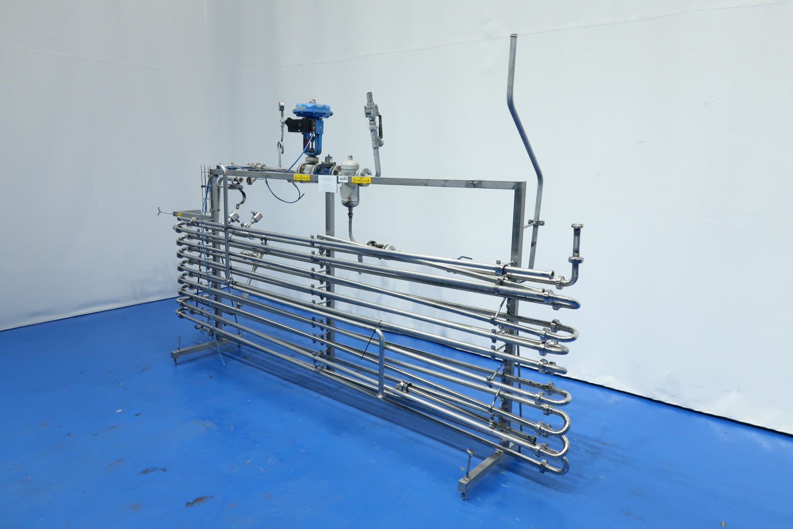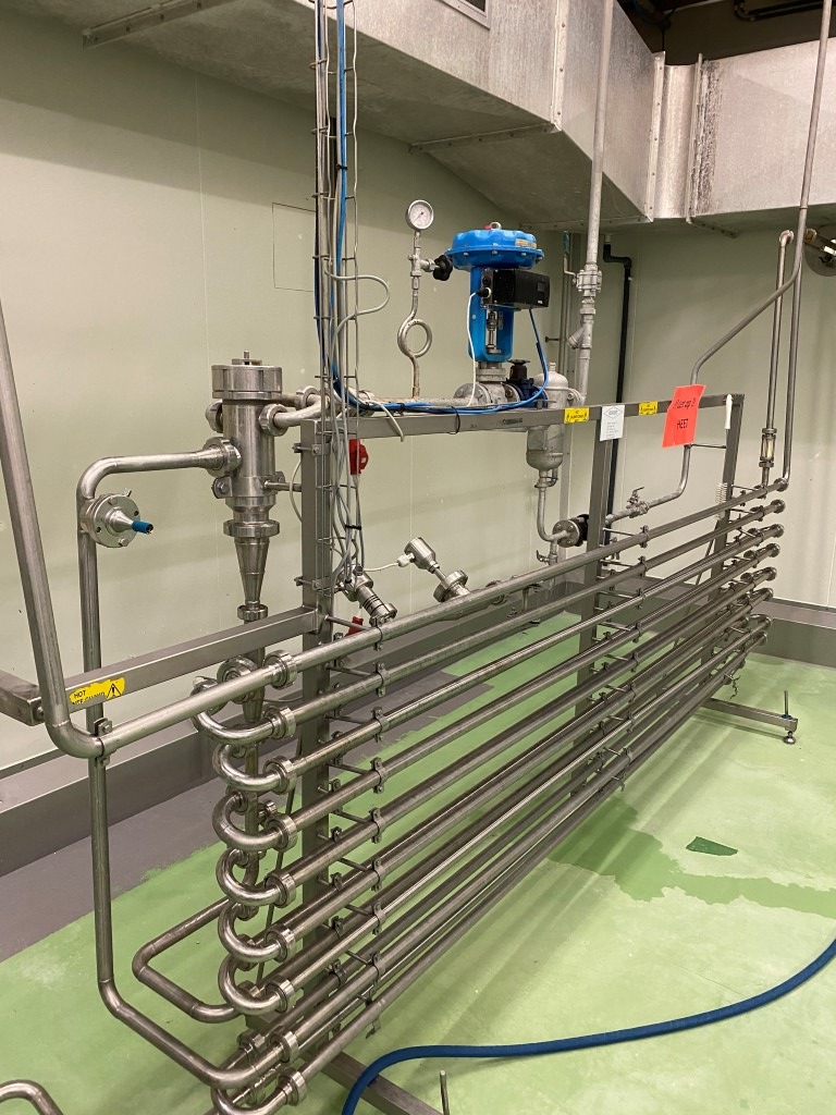 Direct steam injection Heater, used on processed cheese, pasteurisation and sterilisation. including steam valve, steam filter, Temperature and pressure transmitters in the piping system, Holding tube before and after the injector head inner pipe Ø 25 mm - outer pipe Ø 28 mm. Total dimensions: 350x60x190 (lxwxh) cm - weight: 180 kg. (infeed pump and buffertank can be offered on request), capacity variable depending on product, feed pump and temperature scheme between 1000 and 3.000ltr/h.