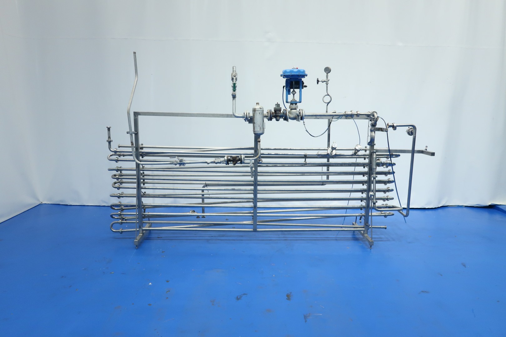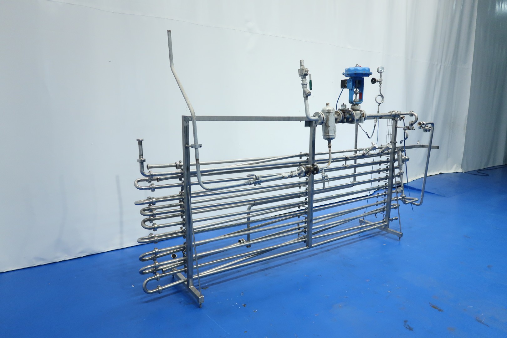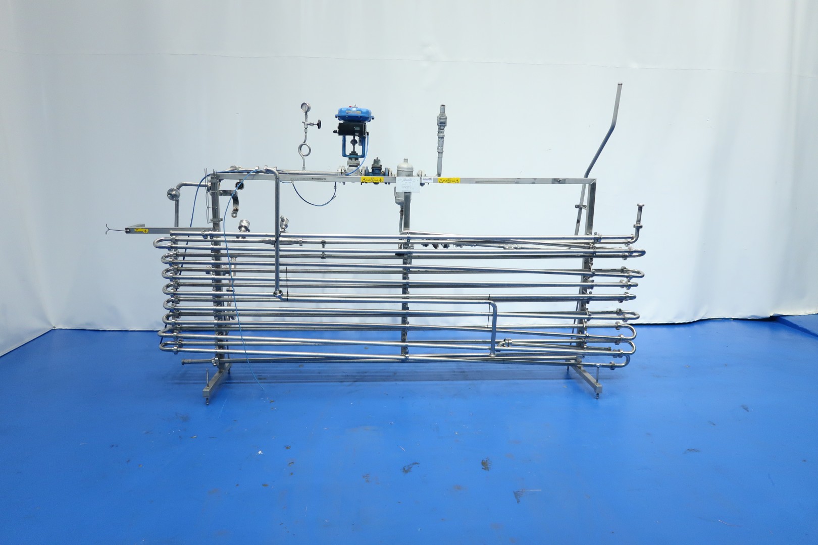 Direct steam injection Heater, used on processed cheese, pasteurisation and sterilisation. including steam valve, steam filter, Temperature and pressure transmitters in the piping system, Holding tube before and after the injector head inner pipe Ø 25 mm - outer pipe Ø 28 mm. Total dimensions: 350x60x190 (lxwxh) cm - weight: 180 kg. (infeed pump and buffertank can be offered on request), capacity variable depending on product, feed pump and temperature scheme between 1000 and 3.000ltr/h.
