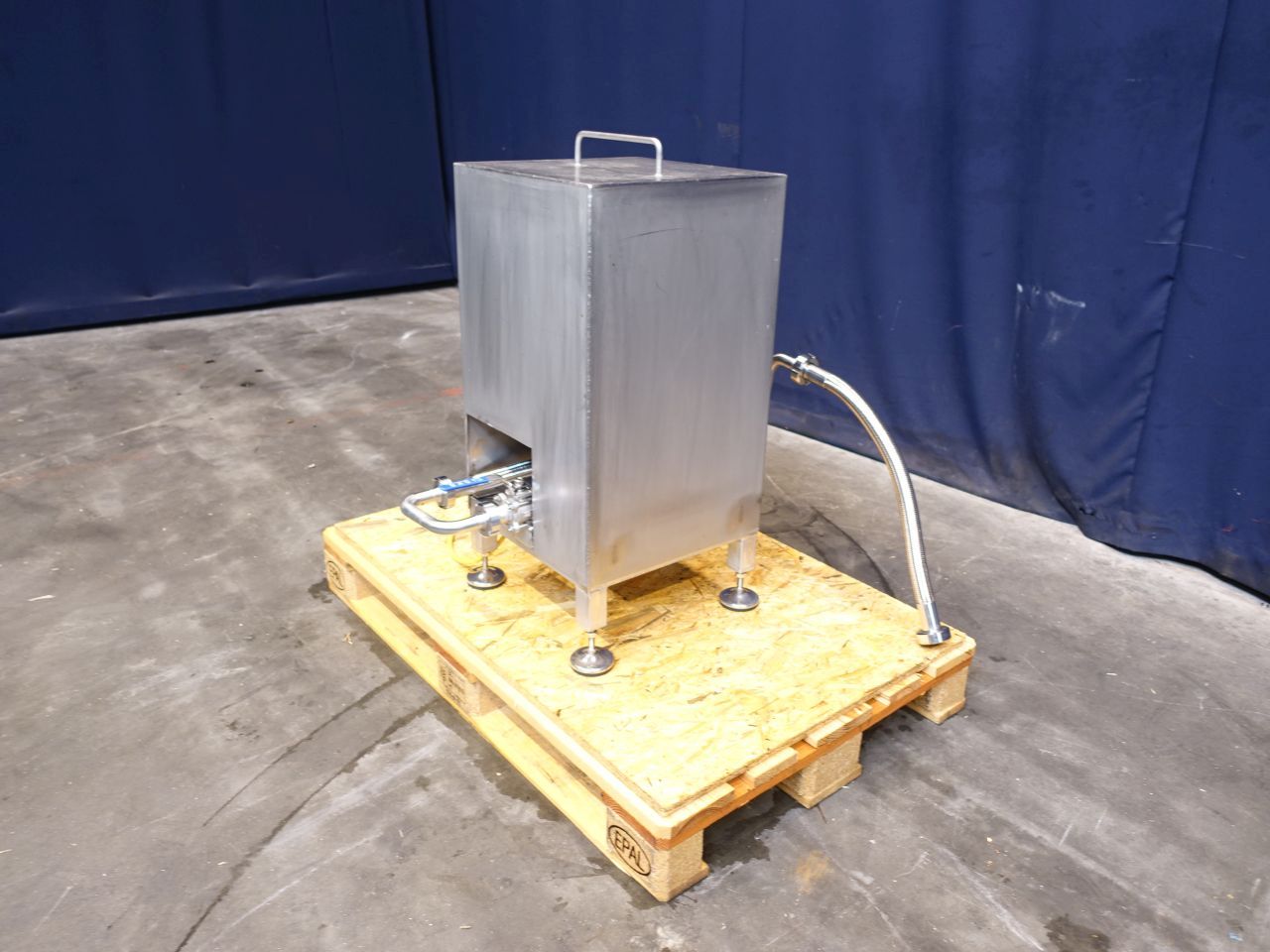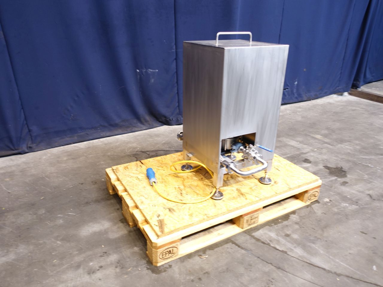 Waterpump. Non sanitary centrifugal pump. Current motor: 0,75 kW - 3400 rpm. Pressure 3,4 bar. Connections: 1'', DIN. Including frequency convertor on the motor.