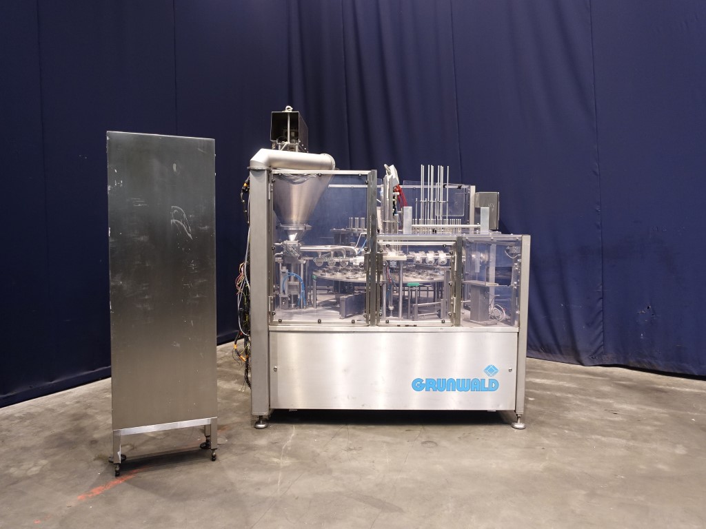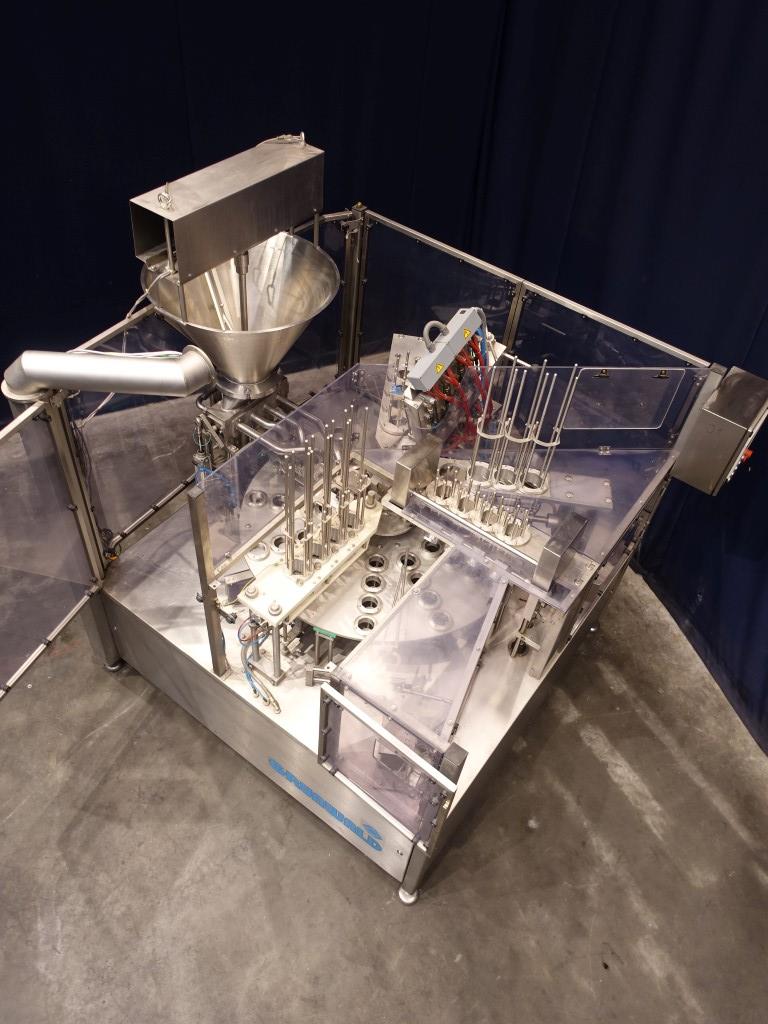Rotatry filler with 4 heads. Cup size: 80mm with rectangular top. Stations: Cup destacking, no- or double detection, piston doser (50-250 ml) for viscose / thin liquid products with hopper and scraper agitator in hopper (manual cleaning), seal dispending by vacuum, tip sealing, heat sealing, etiket dispending by vacuum, snap-on lid, outfeed to outfeed conveyor (outfeed conveyor excluded). Machine has polycarbonate safety guards with sensors. Automatic central greasing system. Controls: Siemens S7 and Siemens Touch screen HMI. Documentation including CE declaration digital available. Total dimensions: 210 x 230 x 245 cm.