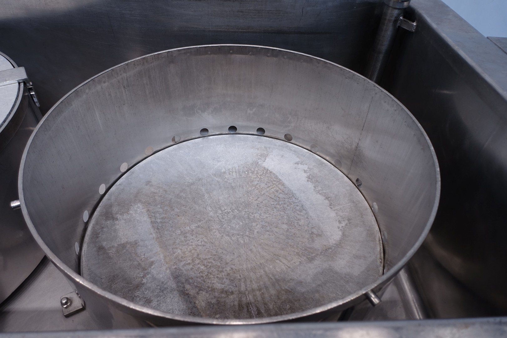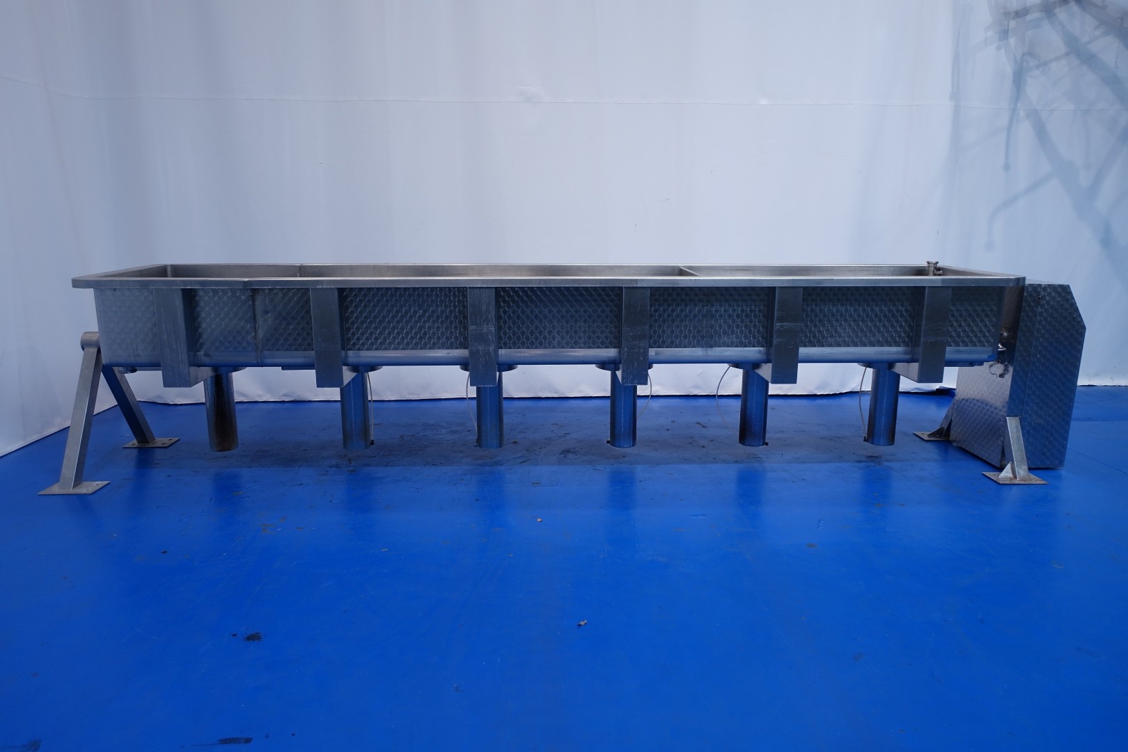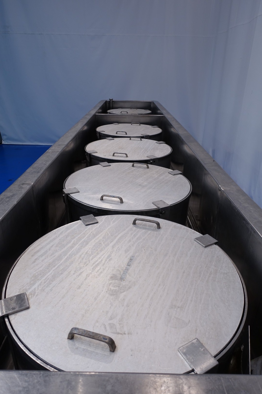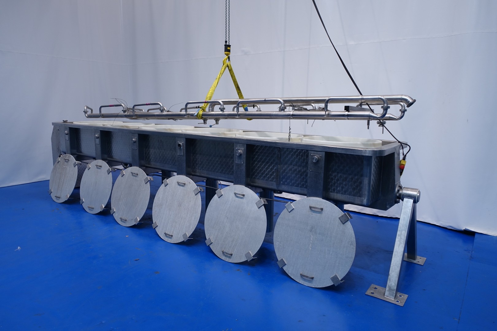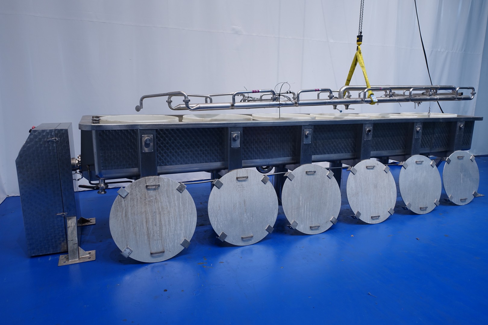 Pressing and moulding system for Big Round Cheeses. In this unit the curd is filled, in the moulds, drained and pressed. Used for production of Emmental cheeses Cylindric round model diameter 75cm. The entire press can be rotated to take out the cheeses. Suitable for 6 cheeses, with pressing cilinders, each with a cover which can be placed in a locked position. Each cilinder has a control button with 3 positions: pressing (up), neutral and release (down). Inner dimension of Cylindric press-mould: diameter 75cm Total height of mould: 32 cm after pressing up to 20cm weight per cheese: 60/85kg. Connections: 1 x 2" Din - 1 x 2,5" Din and 1 x 3" Din. Worked previously as a set with stocknumber 15793, including filling system and framework. Moulds (stocknumber 15762). Total dimensions: 610x110x122 (lxwxh) cm. - weight: 1.380 kg.