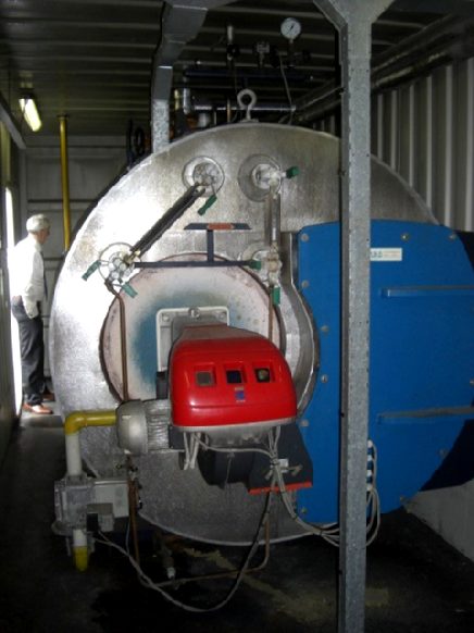 Steam boiler complete mounted in a standard 40"container (12,2mtr length), including all accesoiry, pumps Duijvelaar DPVF4-160 , tanks, water softener (Lubron), chimney, Boiler with gasheater, type RS/60BLU 843, cap. 4,8kW/160 M BLU, cap. 12 bar. Total capacity: 768Kw steam