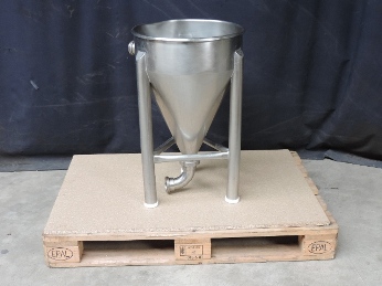 Hopper, open top (no cover/lid), conical and outlet at the bottom, outlet 50 mm DIN, 3 feet. Inner dimensions: diameter 43 cm, height 44 cm. Outer dimensions: diameter 44 cm, height 57 cm.
