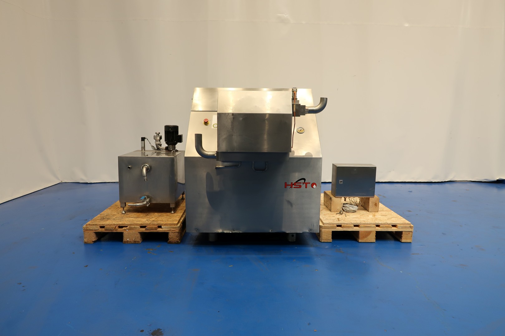 High pressure pump (can be rebuilt to homogeniser). 3 Pistons, piston diameter: 51 mm. Stainless steel cladded. Connections: 2 x 2" pipe. Motor power: 15 kW and maximum pressure in current confirguration with this motor 100 bar. Manometer on inlet (ingoing pressure). Electronic pressure transmitter (IFM) with display on the sensor. Flowswitch on cooling water. Water circulation unit with pump and tank for piston lubrication water tank (for less water use) with 2 x levelsensor, capacity ca. 90 ltr. No controls. Total dimensions high pressure pump: 200x115x130 (lxwxh) cm - weight: 2.288 kg.