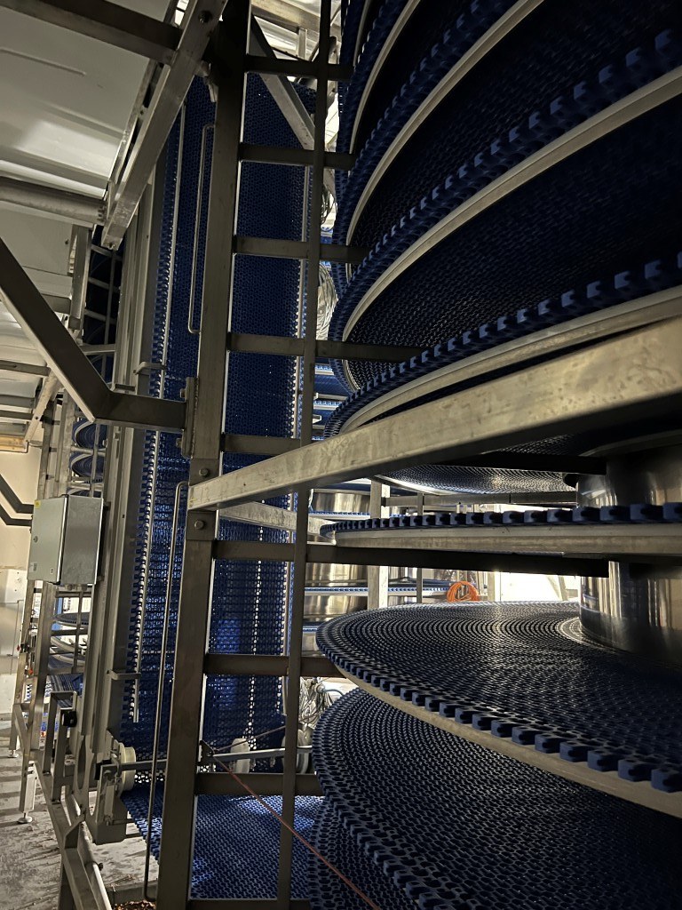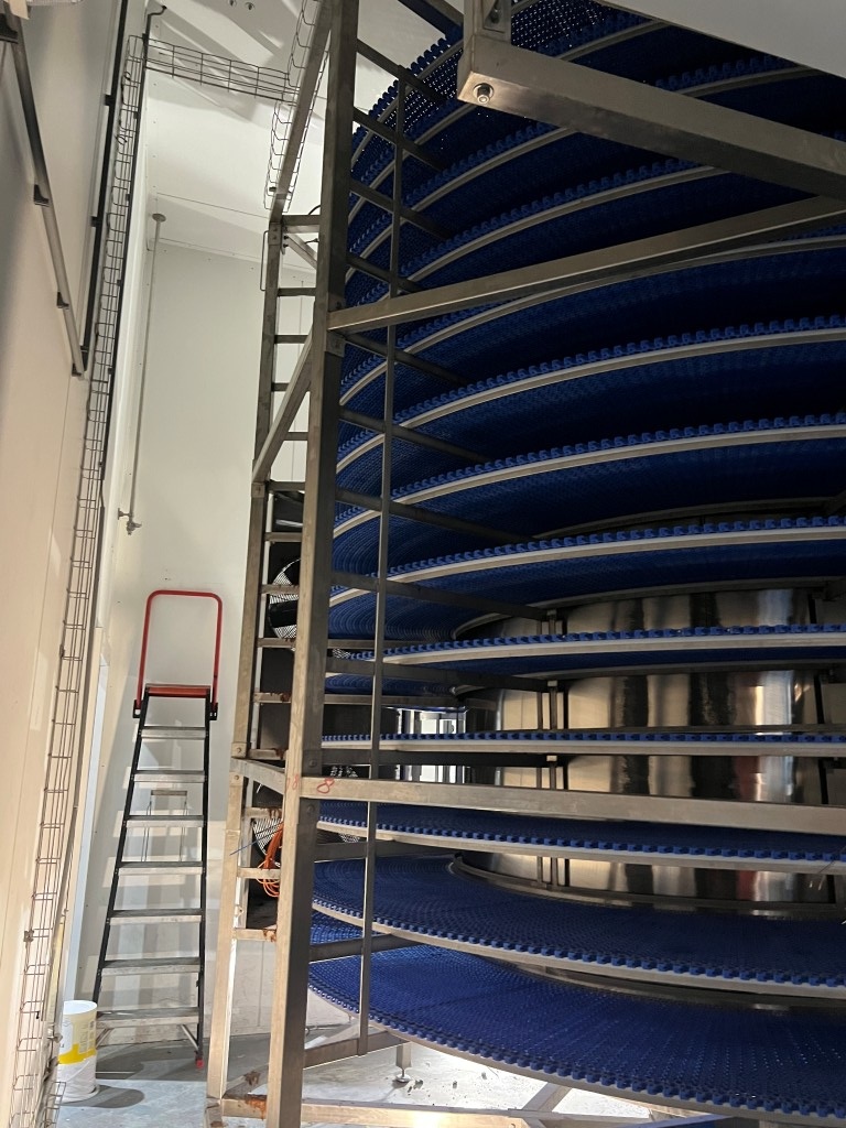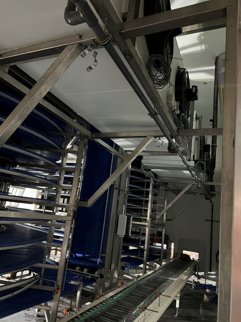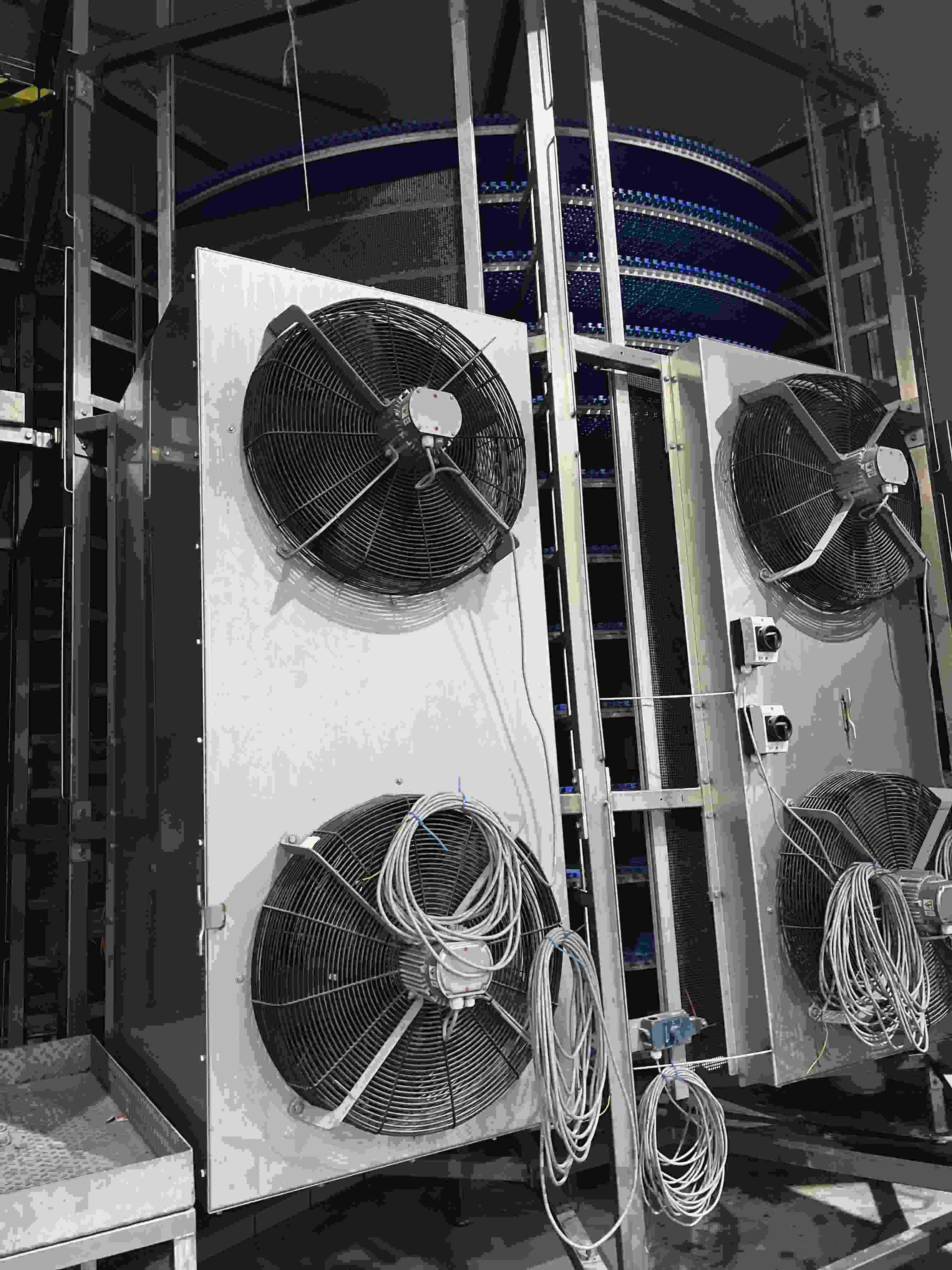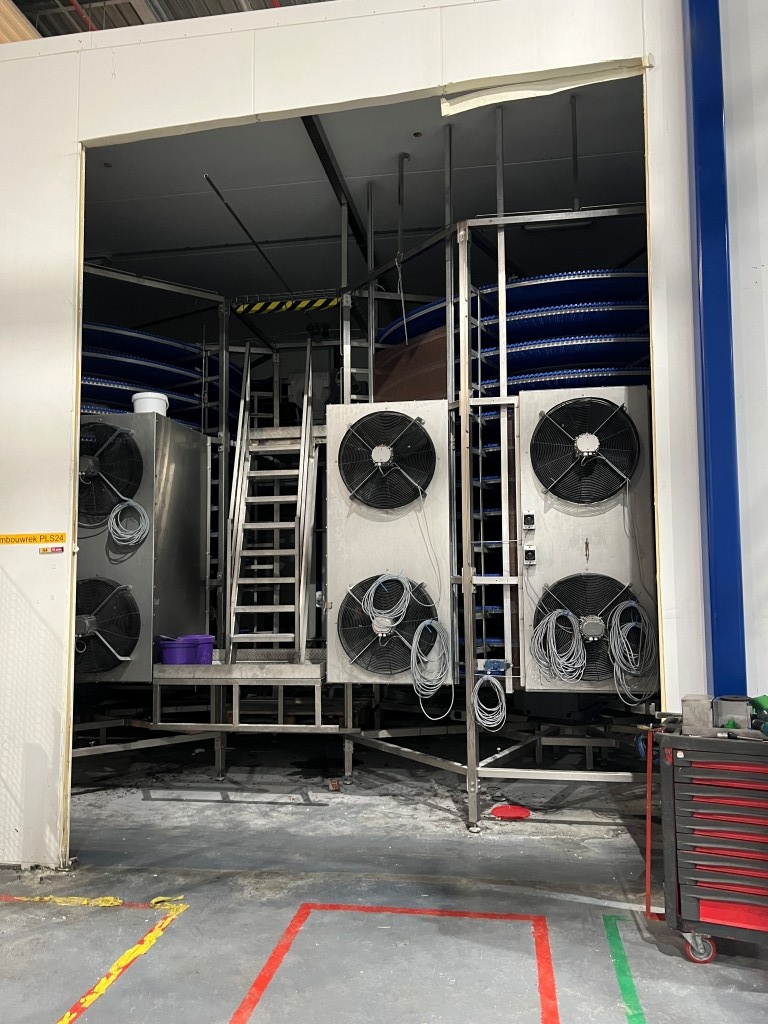 Complete double cooling spiral Belt wide effective: 60cm (total 665mm), tower diameter core: 215cm, + belt total ± 350cm, belt lenght inside cooling chamber: 13 widings ± 175mtr = 105m2 surface. System with cooling compressor (Bitzer Kühlmaschinenbau GmbH), Evaporator (Goedhart), fans, 2 x spirals, roller conveyors, under in going up and under out. Refrigeration technology by: Process cooling technics international B.V. (PCT). Power: 230/400 Volt Capacity upto 3.000 kg/hour +85°C > +40°C. or an different speed in kg/h and temperature range with capacity similar cooling capacity up to 160kW, Evaporator cooling capacity 2x80 kW - cooling medium R 507C, Bitzer compressors. Currently dismanteld and in storage at our facility. Documentation available: user manual and electrical diagram. Dimensions: 8,79x5,43x4,2 (lxwxH) mtr.