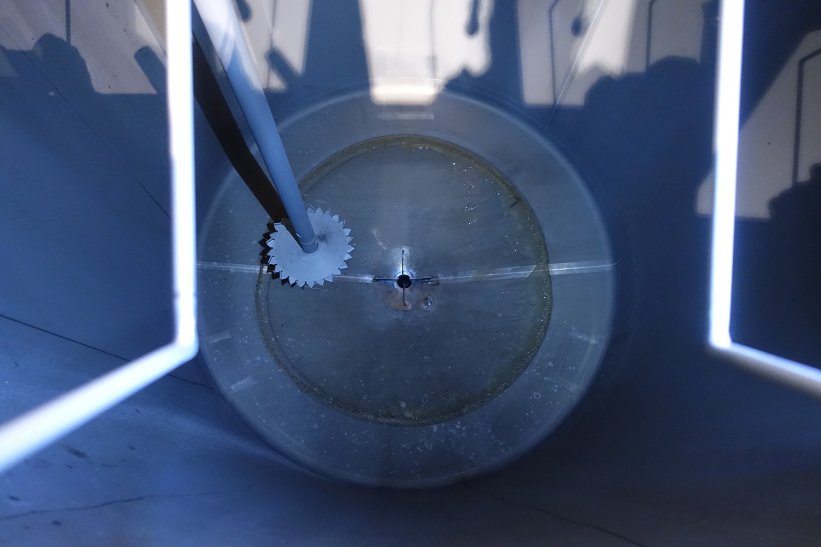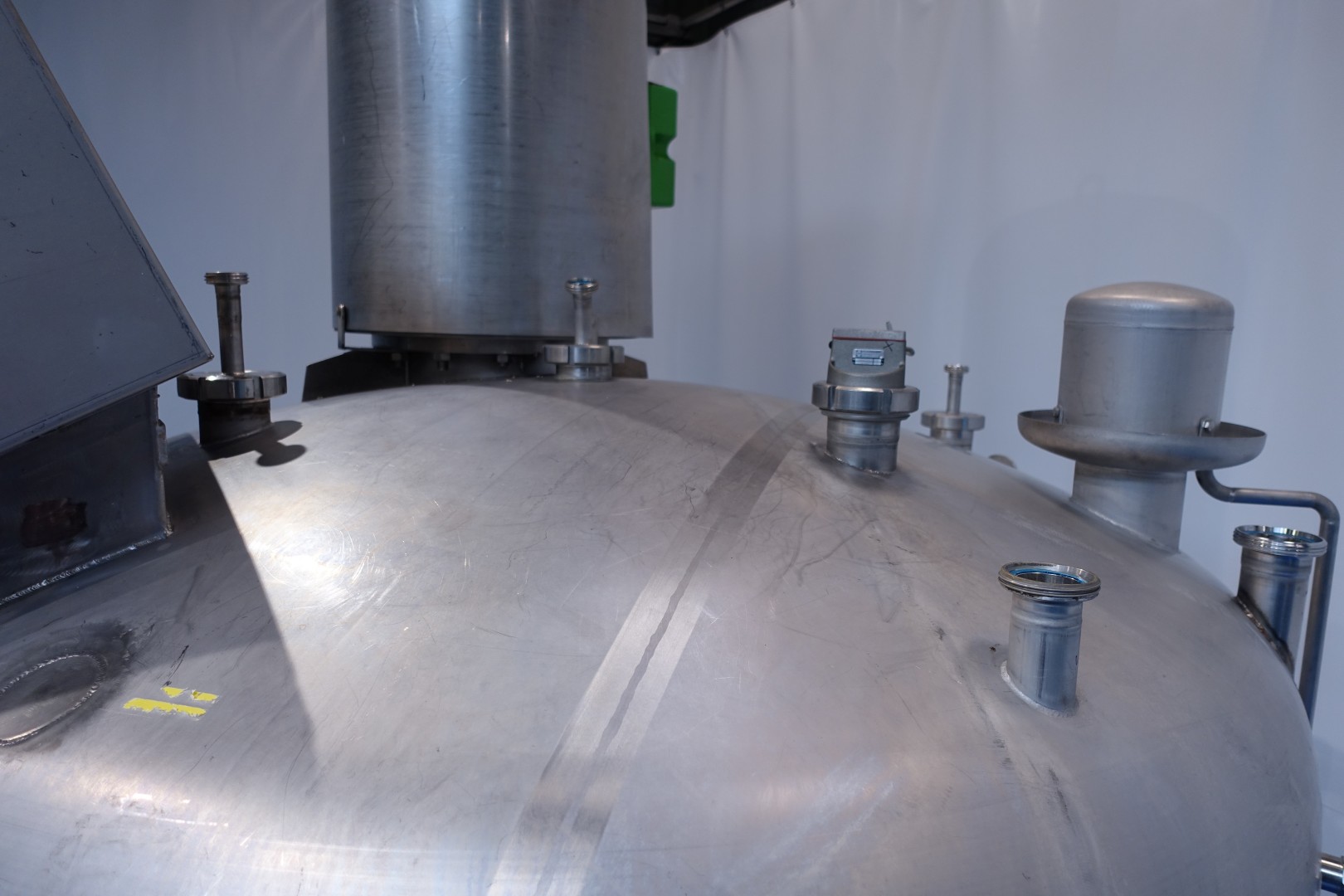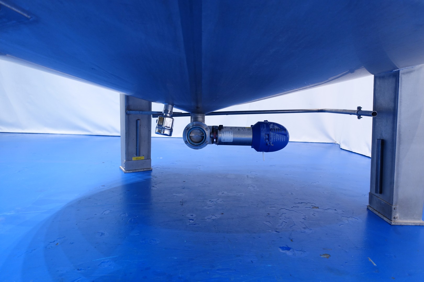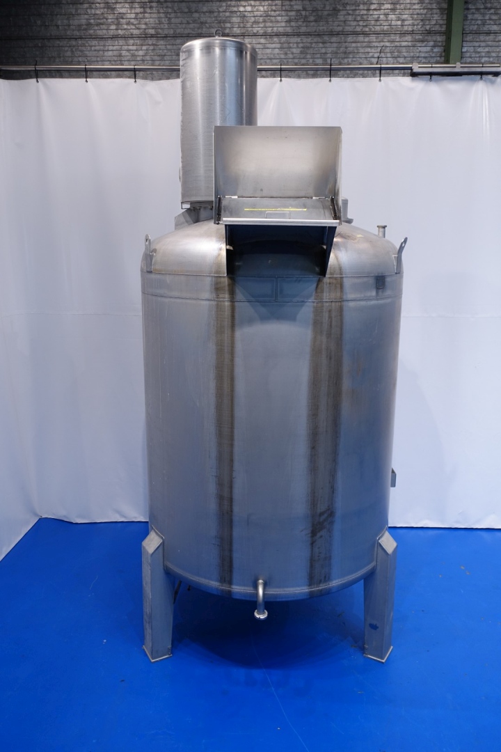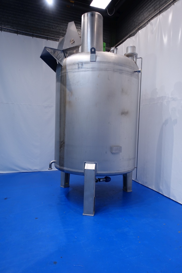 Extreme powerfull Mix and powder dissolving tank. Tank Single jacketed . Top side driven dissolving agitator. Motor power: 45 kW - 81 A - n1: 980 rpm. Working pressure in tank: atmospheric 0. Lamp on top of tank. Product outlet 1 x DN80 Din. Outlet height: 41,5 cm. Including 1 x Think Top pneumatic outlet valve. With 1 x Level sensor in bottom and 1 x level sensor at top side of tank. With breather. 1 CIP spray bowl in top. Rectangular manhole/product-infeed in top: 62x36 cm, special design so bags can be cut and opend at the manhole with gascylinder. 3 Adjustable feet with 3 loadcells. Inside dimensions of tank: Ø 200 cm and cylindrical height 225 cm. Total dimensions: 225x215x465 (lxwxh) cm - weight: 1.550 kg.