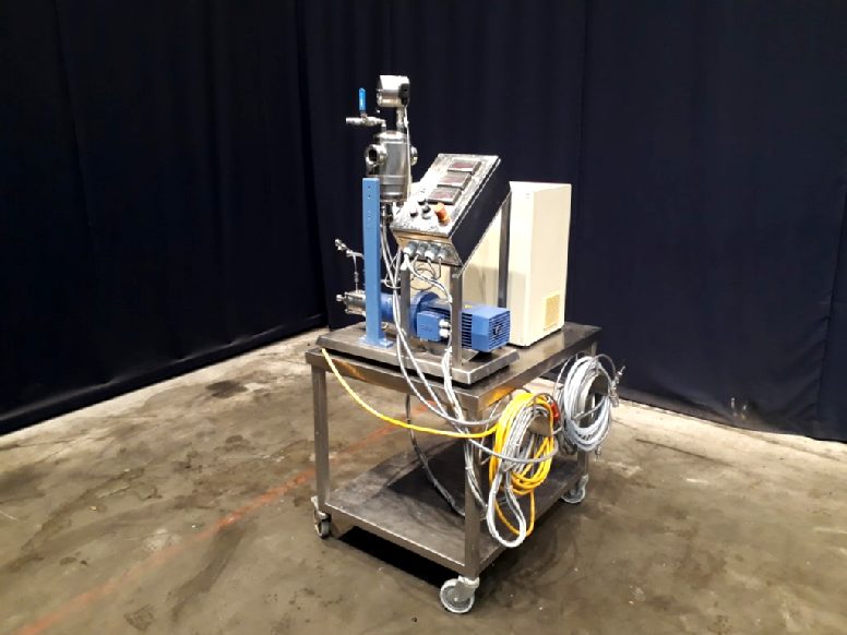 Mobile Laboratory Dispax Reactor (DRL 3/5/246 D) which is a three-stage high shear inline dispersing machine used for the laboratory tests of very fine emulisions and suspensions. Motor: 0,3/1,0 kW - 8/11,5 A - 1200/2520 rpm. 25-50 Hz. Air pressure seal tank (Aerni ARK139, 1997, 5449/3, pressure 25 bar, temperature 200 °C, volume 2,5 liter). Including control panel with temperature, speed and amperage/current readout. Frequenc converter on motor, electric scheme. Total dimensions: 110 x 110 x 185 cm.