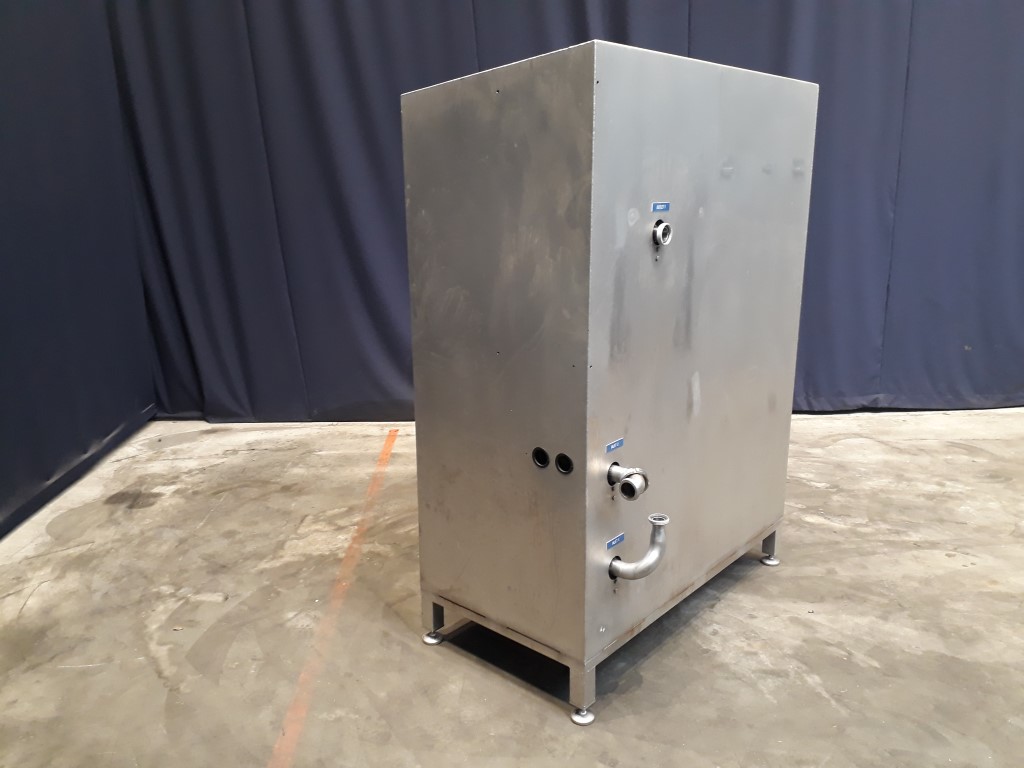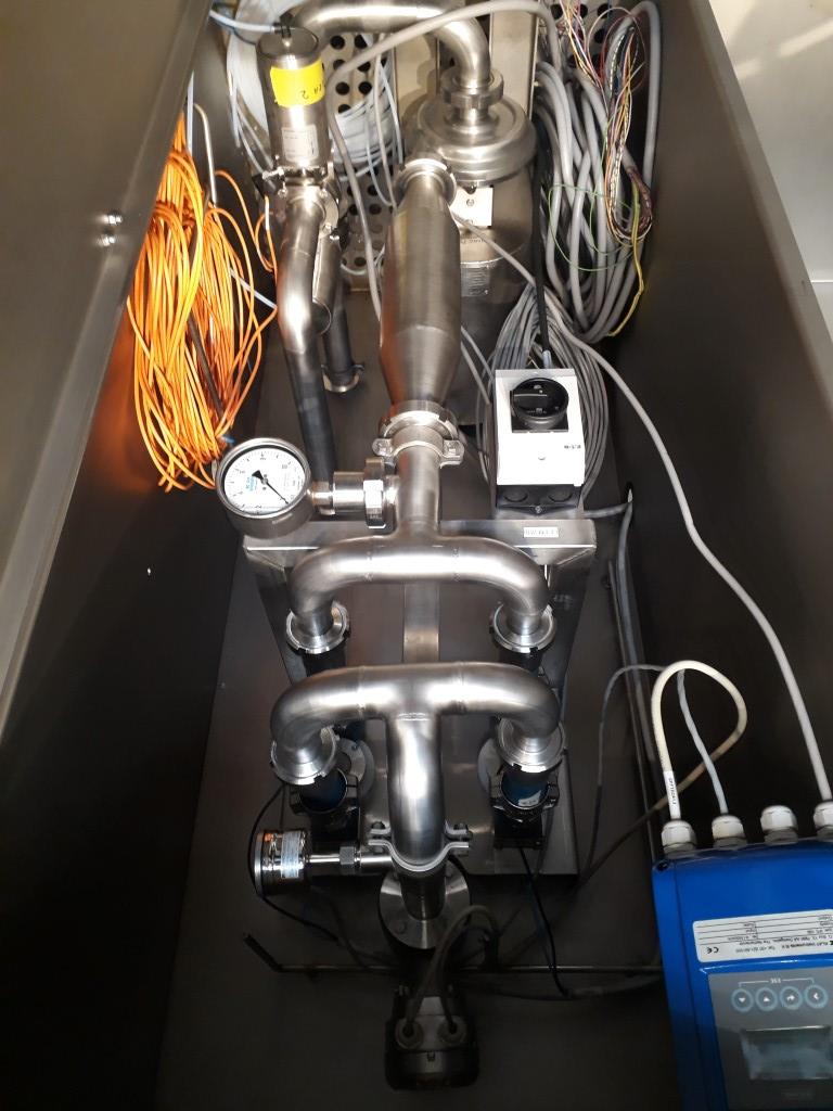 Electro-Chemical Activation (ECA) is the generation of safe, effective, environmentally friendly disinfectants and cleaners by passing ordinary water containing dissolved sodium chloride through an electrolytic cell. ECA unit which is used to prevent algae growth in the rinse water. A DC current is sent through the pipe to kill the algae. Pressure: maximum 8 bar. Krohne IFC 100 flowtransmitter. Pomac CPC16044-105X14 centrifugal pump, motor 1,5 kW - 3.000 rpm. Connections: Inlet 1: 1,5'', Inlet 2:2'', Outlet: 1,5". No manual available.