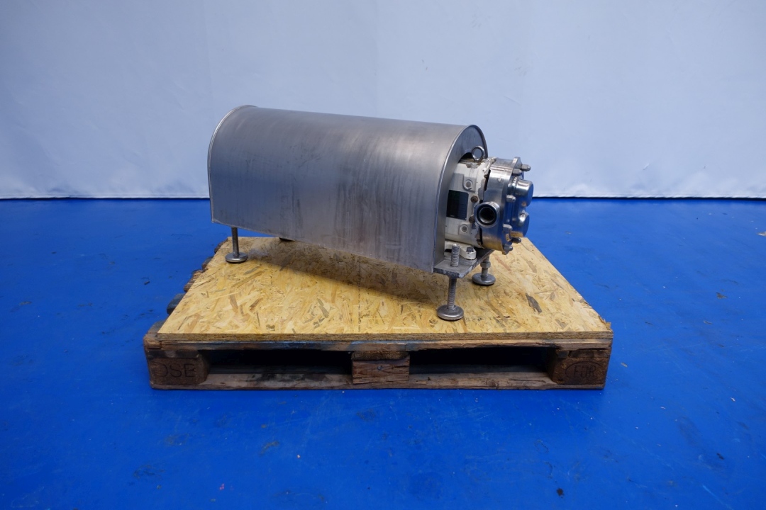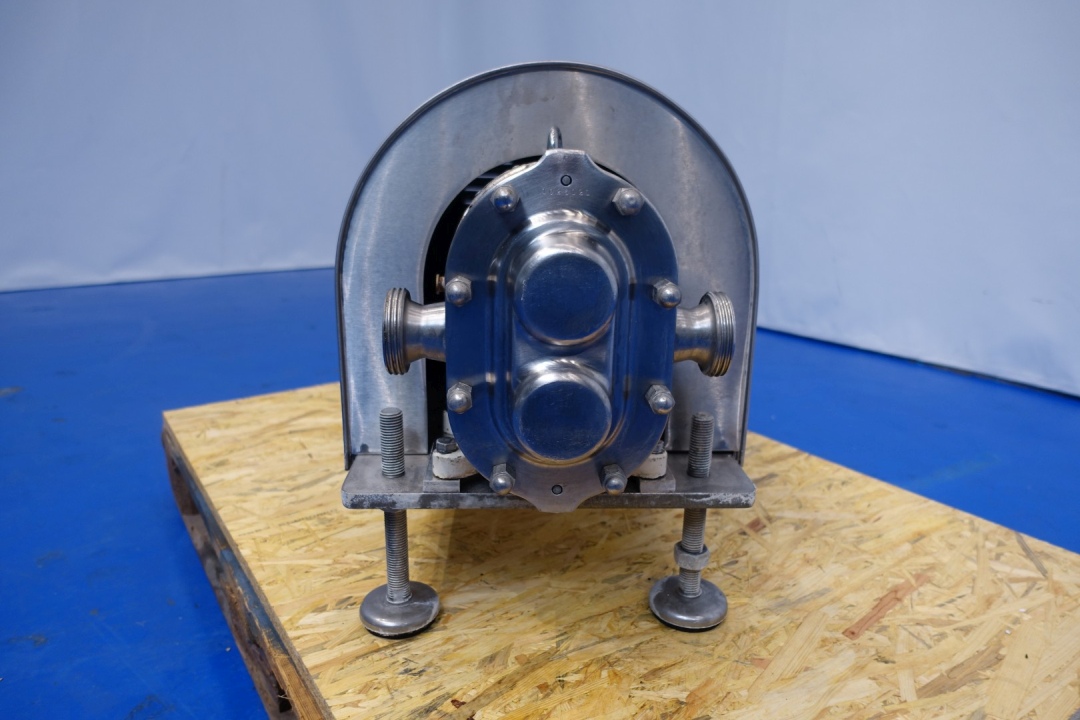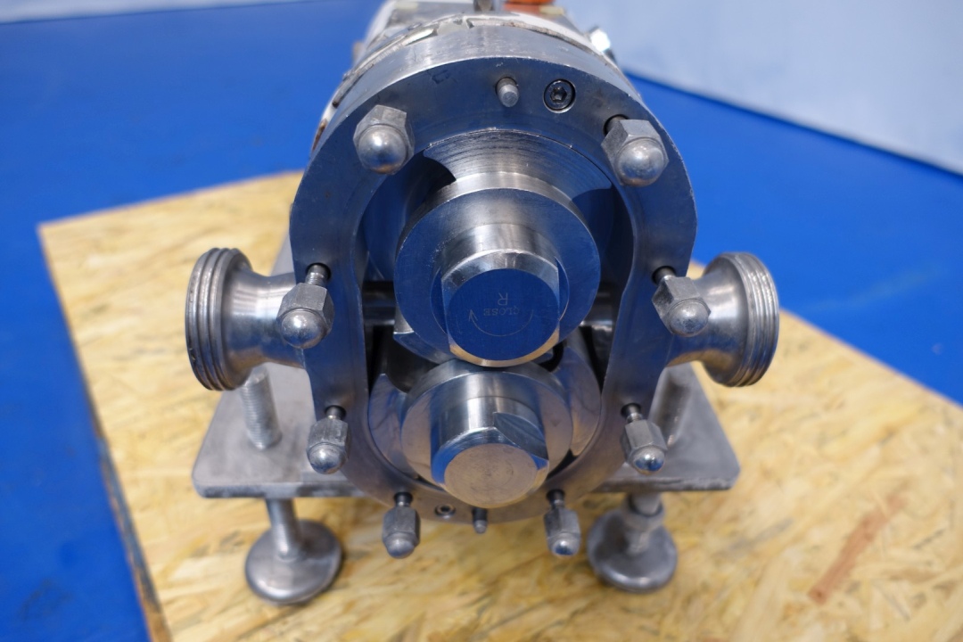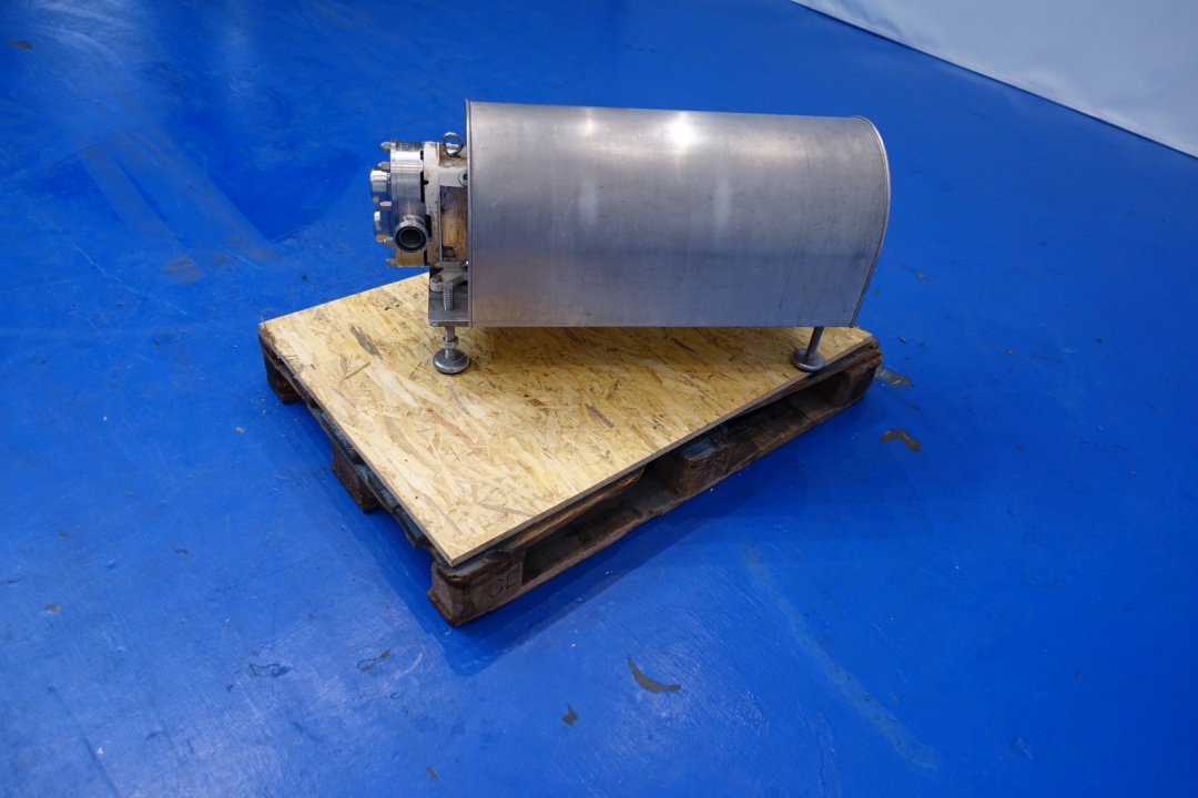 Lobbe pump with duo stainless steel lobbes. Diameter lobbes: 110 mm. Displacement per revolution: 0,22 ltr. Nominal capacity 2.400 ltr/h. Current drive work: motor: 1,5 kW - ca. 3,55 A - 1.430 rpm. Speed 180 rpm. Stainless steel cover over electric motor. Pressure 15,0 bar. Mounted on SS plate with adjustable feet. Connections: (in) 1,5" Din / (out) 1,5" Din. Total dimensions: 97x38x50 (lxwxh) cm - weight: 156 kg.