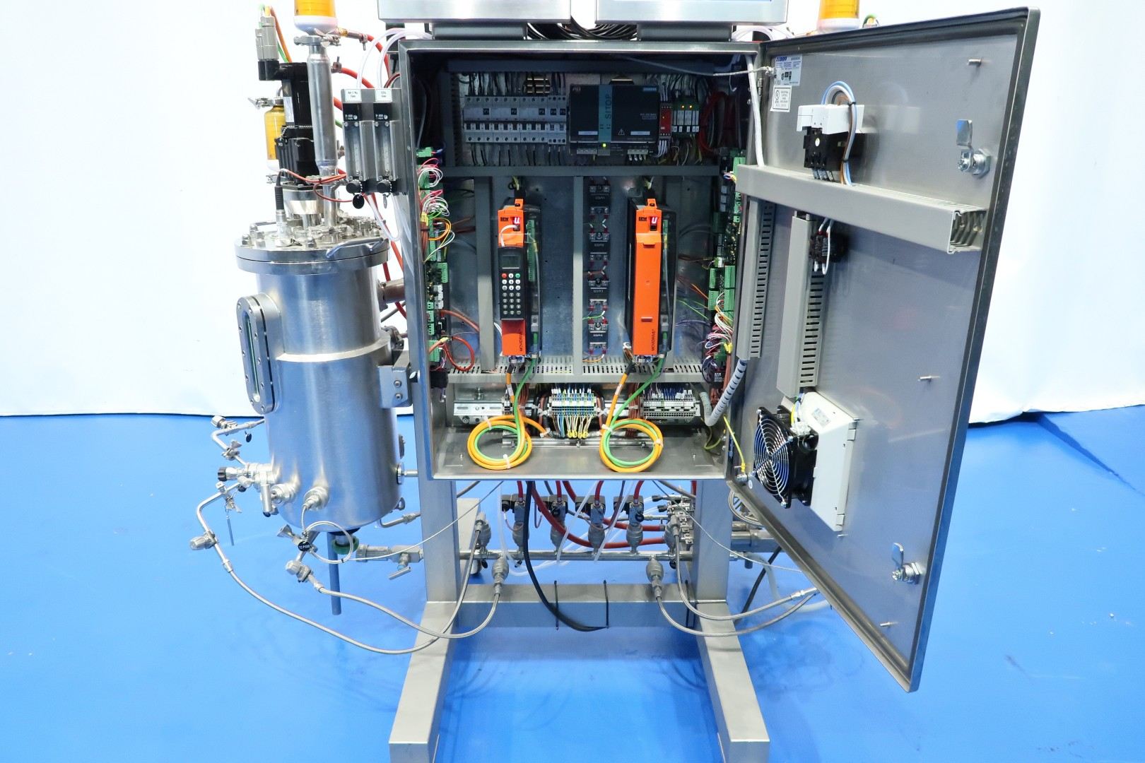 Double bioreactor. Used for fungal applications. Condition: very good. Vessel woking volume 2 x 20 ltr. - jacket 2,0 ltr. - Total volume 2 x 30 ltr. With i.a. following systems/sensors: Air/N2 gas system - Co2 gas system - temperature sensor in vessel and jacket - pressure sensor in lid - both vessels with oval sight glass - both vessels with internal lamp - both vessels with U-shaped agitator (speed frequency controlled servomotor). Material SS 316 (1.4404) and 304L (1.4307). With 2 x Tool-Temp AG, TT-133 pre-heater (water bath) system. Power 2x 13,9 kW. Controls bioreactor: Siemens/Infors with 2 x HMI touch screen. Dimensions bioreactor: 180x100x177 (lxwxh) cm - weight: 237 kg. Dimensions pre-heater: 105x100x132 (lxwxh) cm - weight: 225 kg.