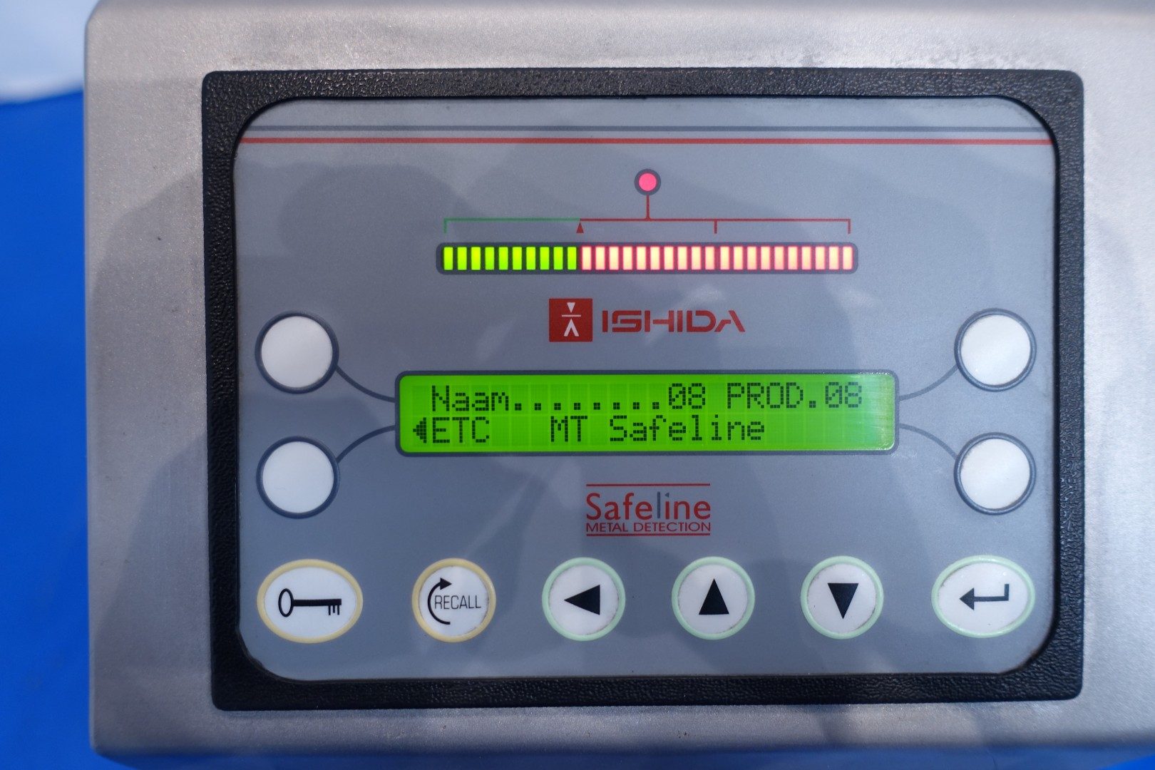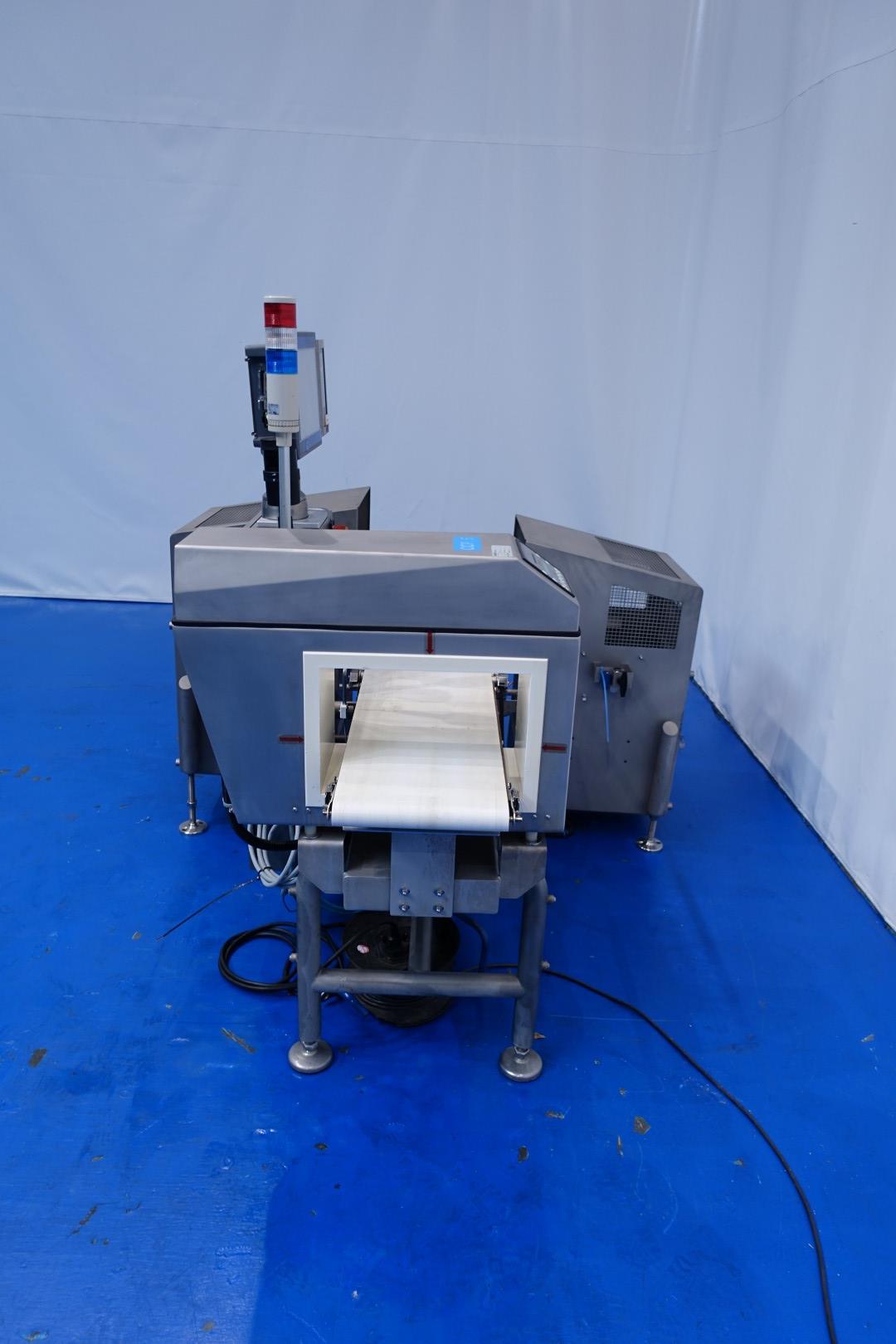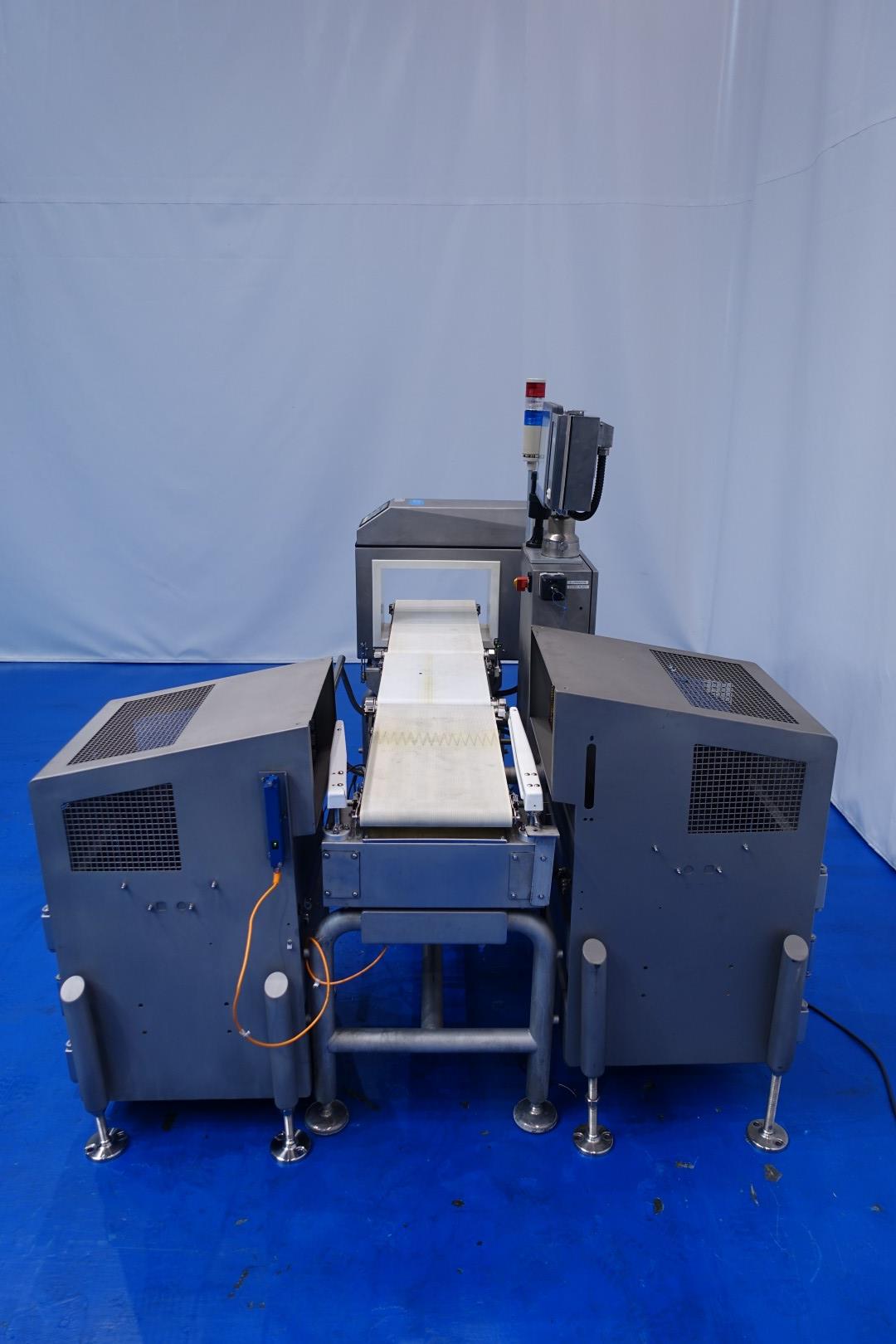 Metal detector and check weigher. Max through put, size of product on conveyor: 300x195 (wxh) mm. Max apperture size: 375x250 (wxh) mm. Max product weight 3.300 gram and min product weight: 125 gram. Including conveyor in 3 parts 180x30 (lxw) cm. Ejecting system by 2 x mechanical arm with 2 SS collection bins. Total dimensions: 180x160x160 (lxwxh) - weight: 364 kg.