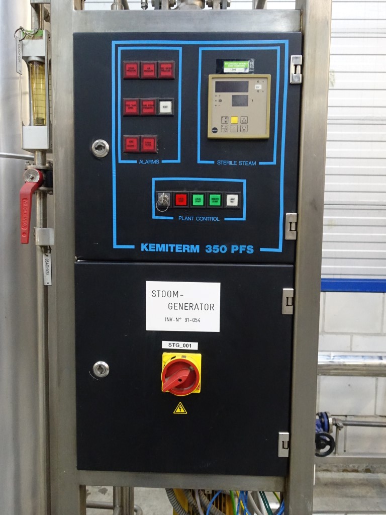 Sterile steam generator, skid mounted. With Tubular heatexchanger: Tube side: 8,5 bar / 0-180°C - 63 liter. Shell side: 8,5 bar / 0-180°C - 73 liter, including valves, control unit, piping. To make sterile steam out of normal steam by an heatexchanger / indirect system. The unit does not make steam. Capacity is estimated.
