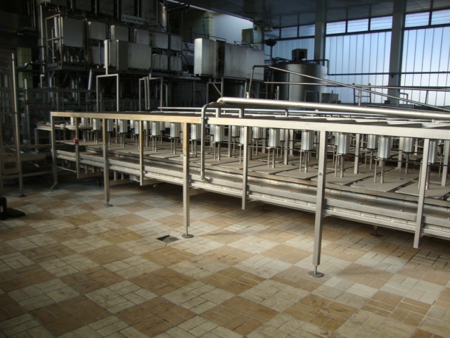 Pawl conveyer press for cheese moulds consisting out of 2 rows of 40 cylinders each total 80 press places.1 cylinder 1 mould, With pneumatic infeed system and spray pipe for cip cleaning. Including 2 sets of micro perforated rectangular cheese moulds. First set of 100 moulds for standard ‘Euroblock’ format. Each cheese per mould 15 kg, size: 50x30x20 cm. Second set of 120 Multiforms. 5 rectangular "bread" cheeses per form, Each cheese 3-3.5kg. Size per cheese 25x12.5x±10-12c. Moulds have springs in cover for equal pressing. No controls. Total dimensions: 18.80 x 1.90 x 2.26 mtr.