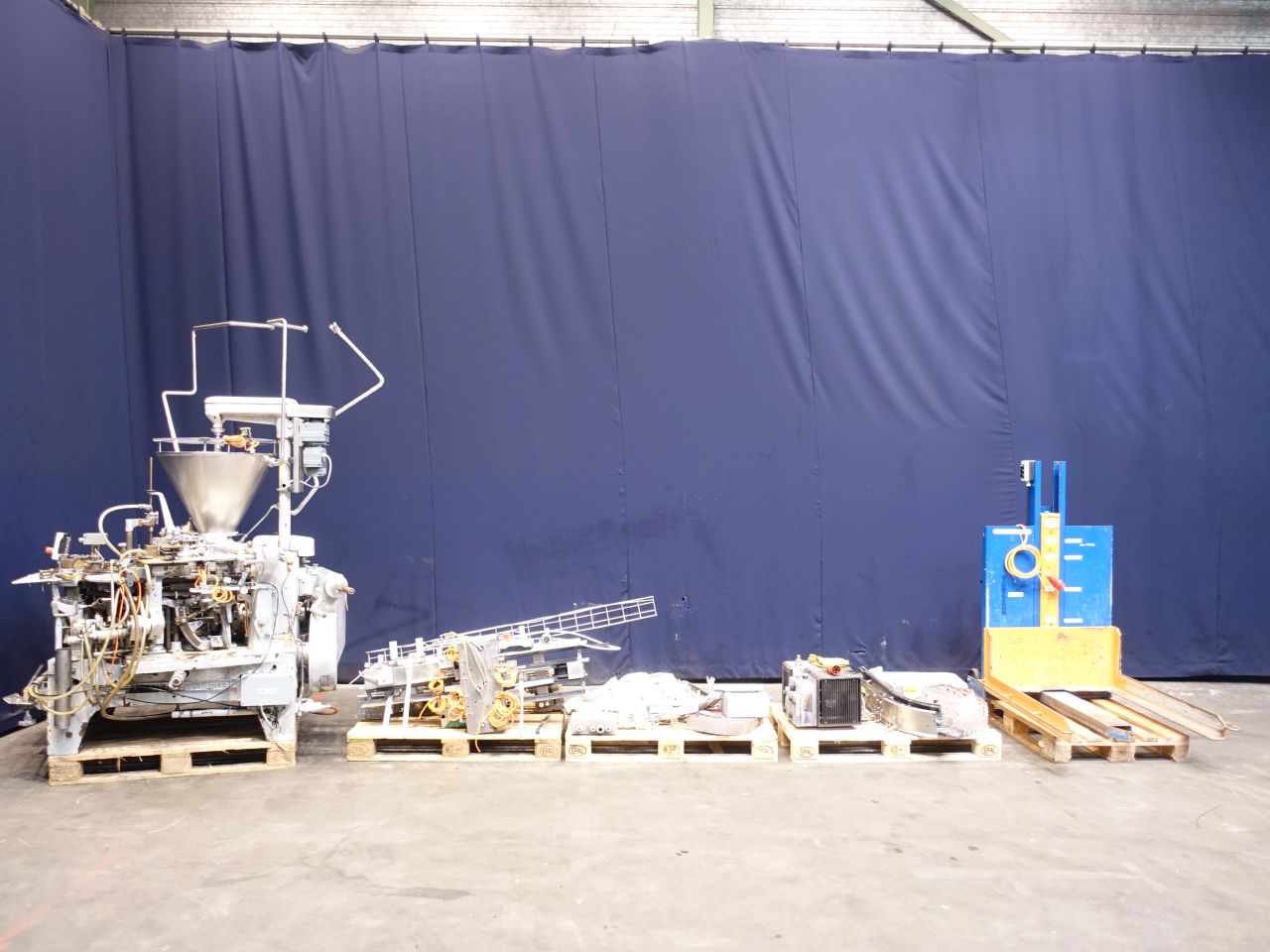 Automatic filling and wrapping machine for processed cheese or cream cheese. Liquid hot fill. 10 Step turn table. Current format: 100 gram, ± 50 x 80 x 26 mm. Feeding by double jacketed hopper with agitator. Bottom foil forming, filling, top foil cutting and placing on product, heat sealing and outfeed arm to conveyor. STN14385 + STN14386 have been running together in the same factory. The following parts are used for both machines, but will be sold with STN14385: several transport conveyors, collector to collect by 6 pieces from 2 conveyors to 1, control panel, vacuumpump, pallet-elevator for easy putting boxes on pallet (by hand). Total dimensions Kustner machine: 240 x 320 x 250 cm. Has been running together with STN14386, STN14387 and STN14388.