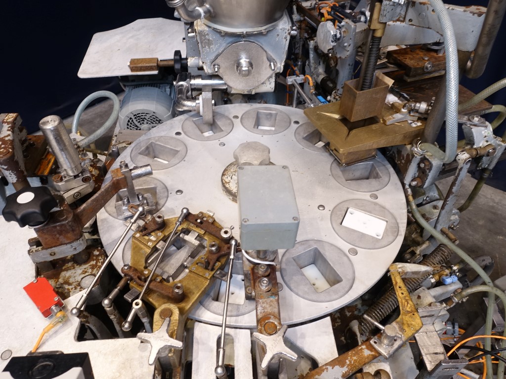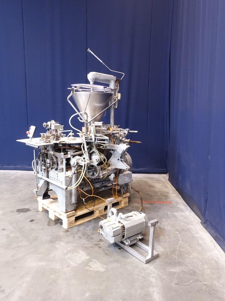 Automatic filling and wrapping machine for processed cheese or cream cheese. Liquid hot fill. 10 Step turn table. Current format: 100 gram, ± 50 x 80 x 26 mm. Feeding by double jacketed hopper with agitator. Bottom foil forming, filling, top foil cutting and placing on product, heat sealing and outfeed arm to conveyor. STN14385 + STN14386 have been running together in the same factory. The parts which are for both machines (control panel, conveyors etc) will be sold with STN14385. Total dimensions Kustner: 240 x 320 x 250 cm. Has been running together with STN14385, STN14387 and STN14388.