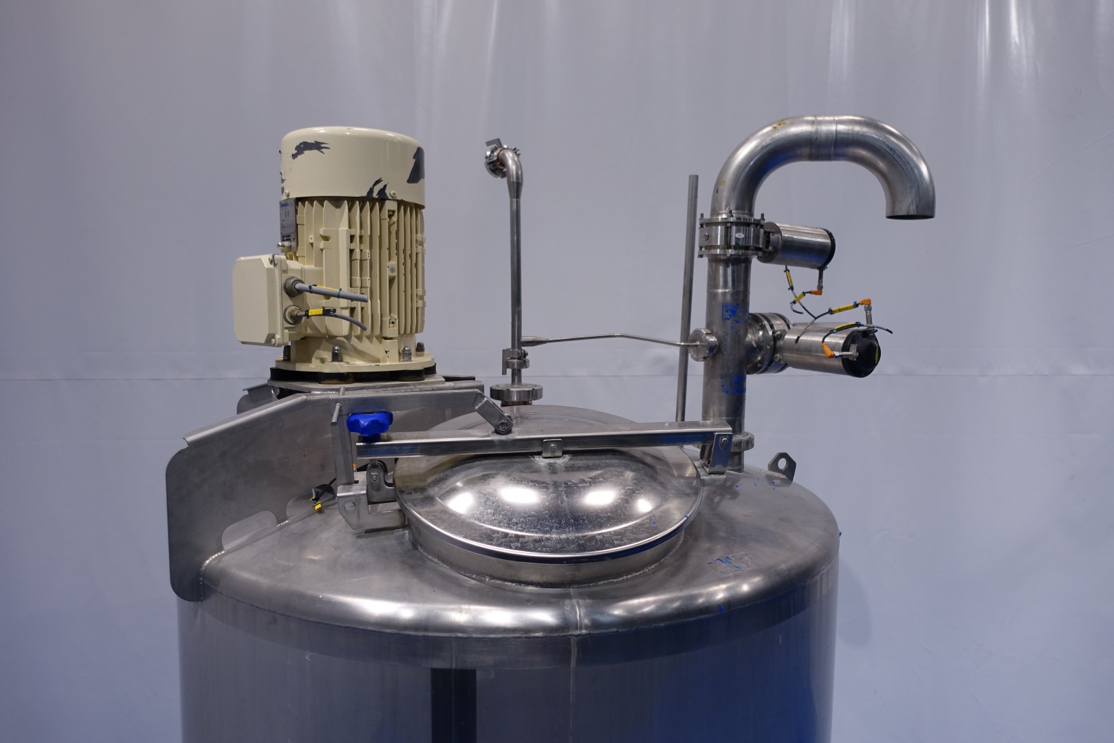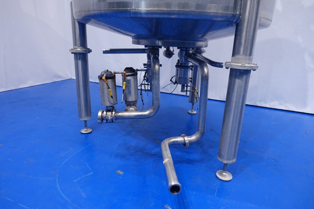 Vertical single jacketed storage tank with Jongia mix agitator. Nominal volume: 2.100 liter. Maximum cleaning temperature: 85°C.Top driven propellor agitator, Jongia type: JDR 7,5/4B - built in 2016 - motor: 5,5 kW - 12,5 A - 710 rpm. With pressure transmitter and outlet valve in bottom. 2 CIP spray bowls of which one in product inletpipe. 3 Adjustable feet. Outlet height ca. 71 cm. With 2x bottom double seat mix proof valves with 2 position sensors make: Südmo (pentair). 2 connections to be able to flush the outlet pipe even when tank is full. Manhole in top round Ø 51 cm. Inside dimensions of tank: Ø 150 cm - cylindrical height: 125 cm. Total dimensions: (lxwxh) 150x150x320 cm - weight: 544 kg.