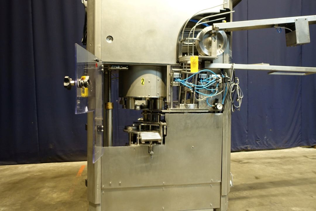Metal Can closing, seaming machine. Stand-alone and fully automatic. Suitable for seaming lids onto cans, equipped with 4 seaming stations. Working principle: The incoming cans are synchronized to the machine by a specially constructed infeed gear-wheel. An electro-pneumatic system manages the required feed of lids as required (“no can –no lid”). After separation of the lid in the lid magazine, it will be fed to the transfer point of lid & can via the lid/can transfer turret. During its cam-controlled upward movement the filled can receives the lid, which was laid out in a special lid slide. Can and lid are clamped between lifter plate and seaming head.The can is seamed by a start roll and finish roll while the cans are rotating during the seaming process. After the seaming process, the cans are handed over to a outfeed conveyor. Can diameter: 127 mm. Range of can diameter according brochure: 99-153 mm and height 20-250 mm.Electrical: 400 V - 50 Hz - 3,5 kW. Total dimensions: 130 x 120 x 240 cm. Machine is without control panel!