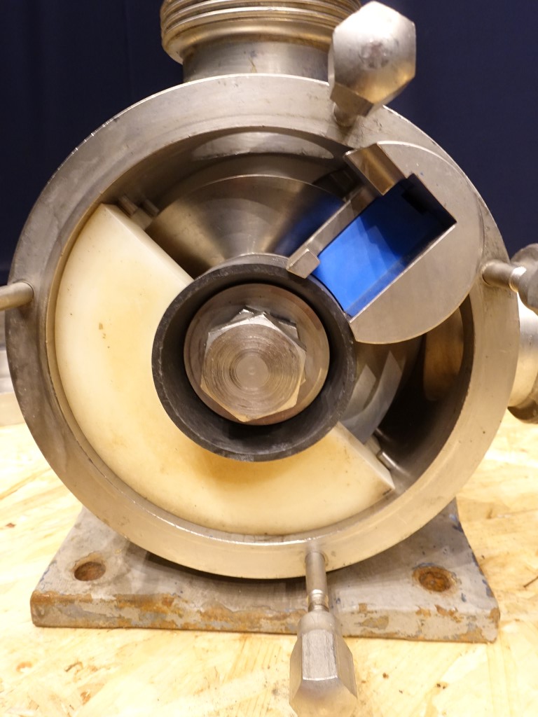 Sine shaped pump. Impellor diameter 165 mm. Displacement per revolution: 0,45 ltr. Maximum particle size: 19 mm. Maximum speed: 600 rpm. No motor or drive. Connections: 3'' / 3'', SMS.