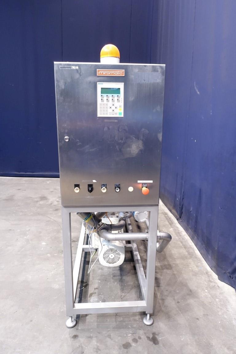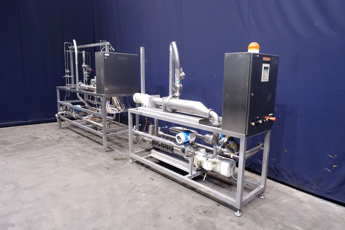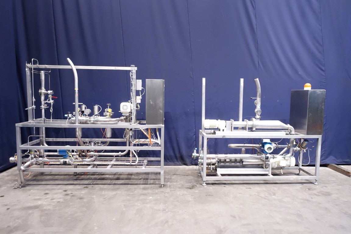 Inline Quark mixing device to add Cream to fresh cheese to increase the fatt content. 2 ingredients, Cream and fresh cheese are added together by regulating the speed of the cream pump (Eccentric screw pump make Seepex, type: BCSO Size10 pressure12bar, 2,3kw) controlled by 2 flowtransmitters (Make Endress & Houser model Promag 53H40. After injecting the cream the 2 ingredients are mixed together in a rotary mixer model KME150 (150mm diameter with a variable speed mixer inside), skid mounted including all by-pass and product valves, sample valve, controls only remote I-O (no plc/program). 2de skid to connect containers with 2 inline filters and by-pass valves. After injecting the cream the 2 ingredients are mixed together in a rotary mixer Miromatic model KME150 (100mm diameter with a variable speed paddle mixer inside), skid mounted including all by-pass and product valves, 3 steamable sample valves, incomplete controls (no program).
