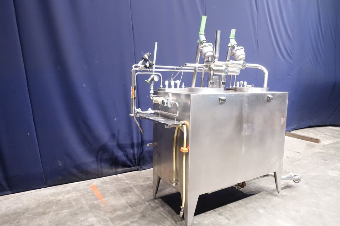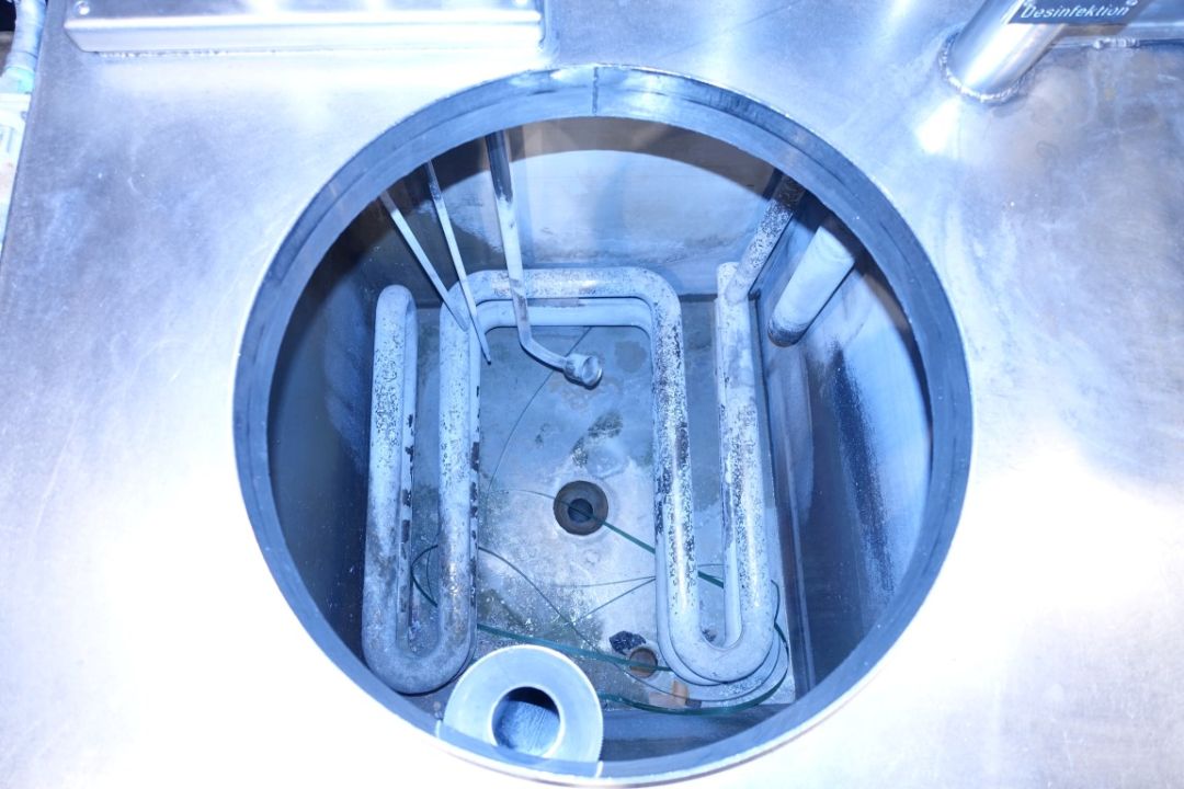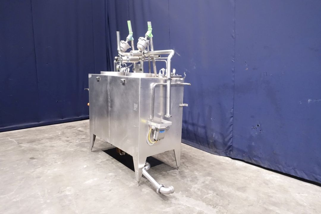 Multichamber tank. 1x Tank for water/desinfection. 1x Tank for lye or acid. Manhole in top, both tanks with spiral-Coil heatexchanger steam->product to heat the water or detergent by steam. Temperature and level sensors, steam valves and valves for cleaning detergents. Total dimensions: 250 x 80 x 220 cm.