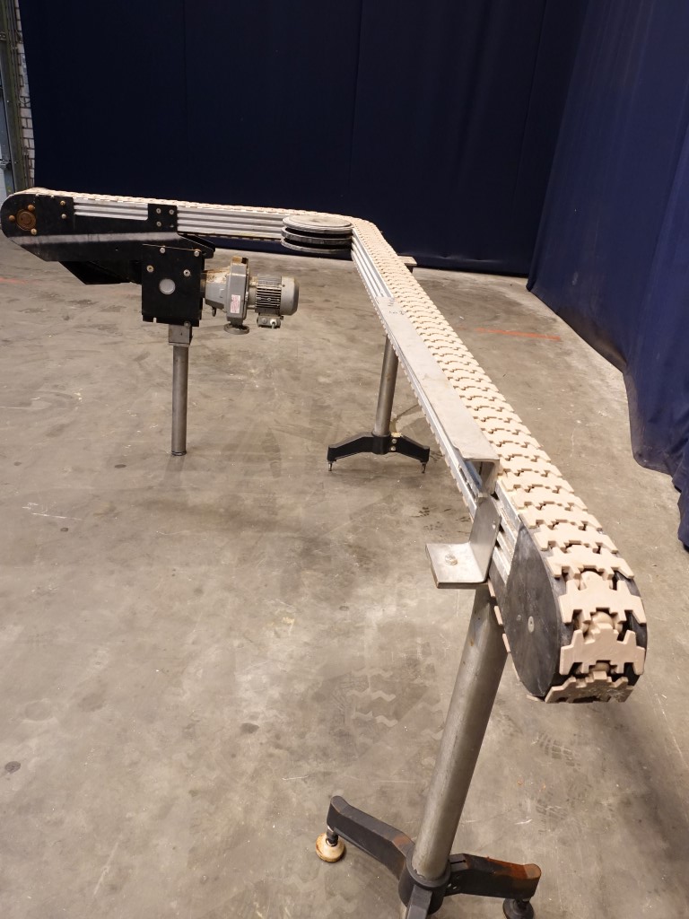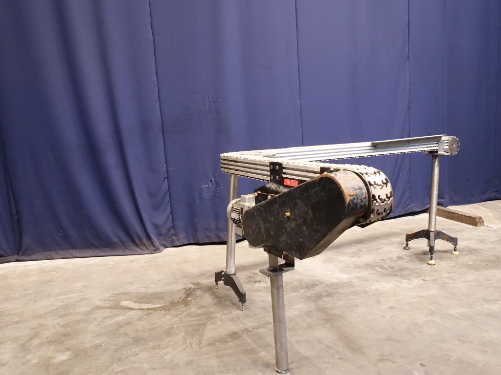 Chain conveyor. Effective Belt lxw: 350 x 8 cm. Including 90° corner. Motor: 0,37 kW - n2: 12,6-62 rpm, variable speed with mechanical variator. Horizontal. Total dimensions: 150 x 230 x 110 cm.