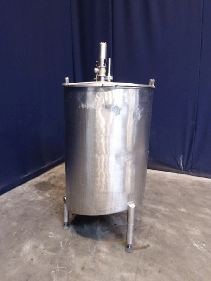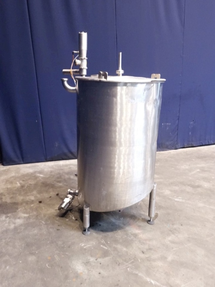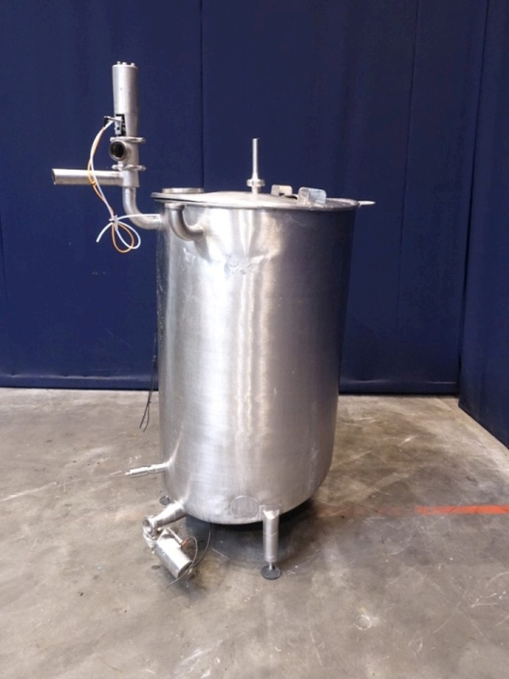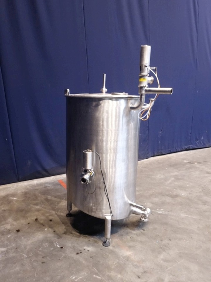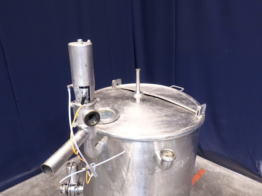 Level tank. Half open top. Flat to the side. Product outlet 2'', SMS. Outlet height: 20 cm. Butterfly valve for drain. Connector for low level. CIP spray plate. 3 Adjustable feet. Inside dimensions of tank: diameter 78 cm and height 105-125 cm. Total dimensions: 110 x 100 x 185 cm.
