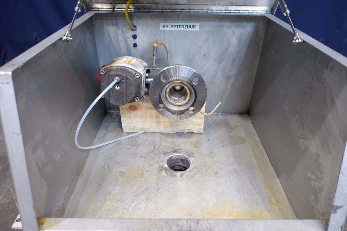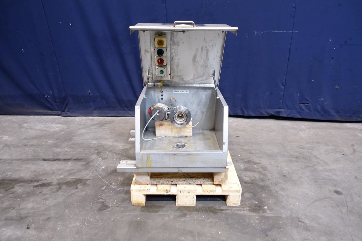 Reception unit for lye or acid or other chemicals delivered by truck. Outside mounted to pump chemicals to a tank.