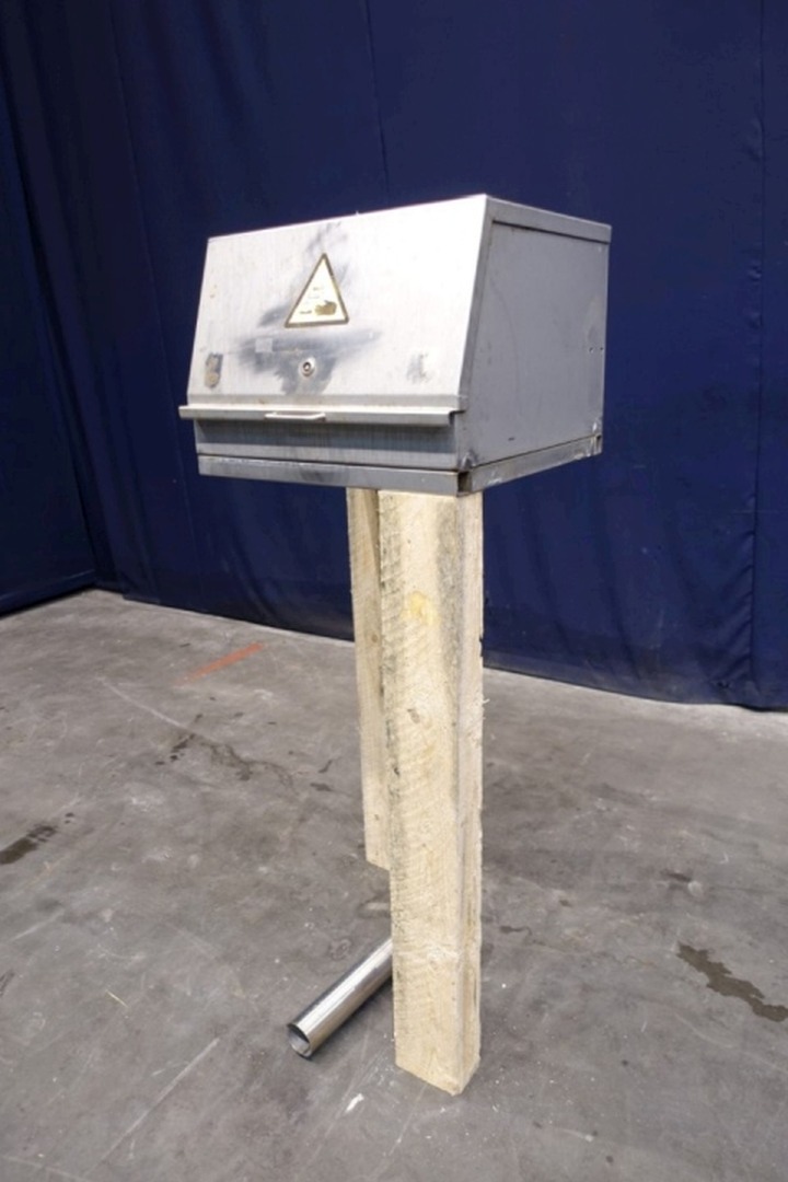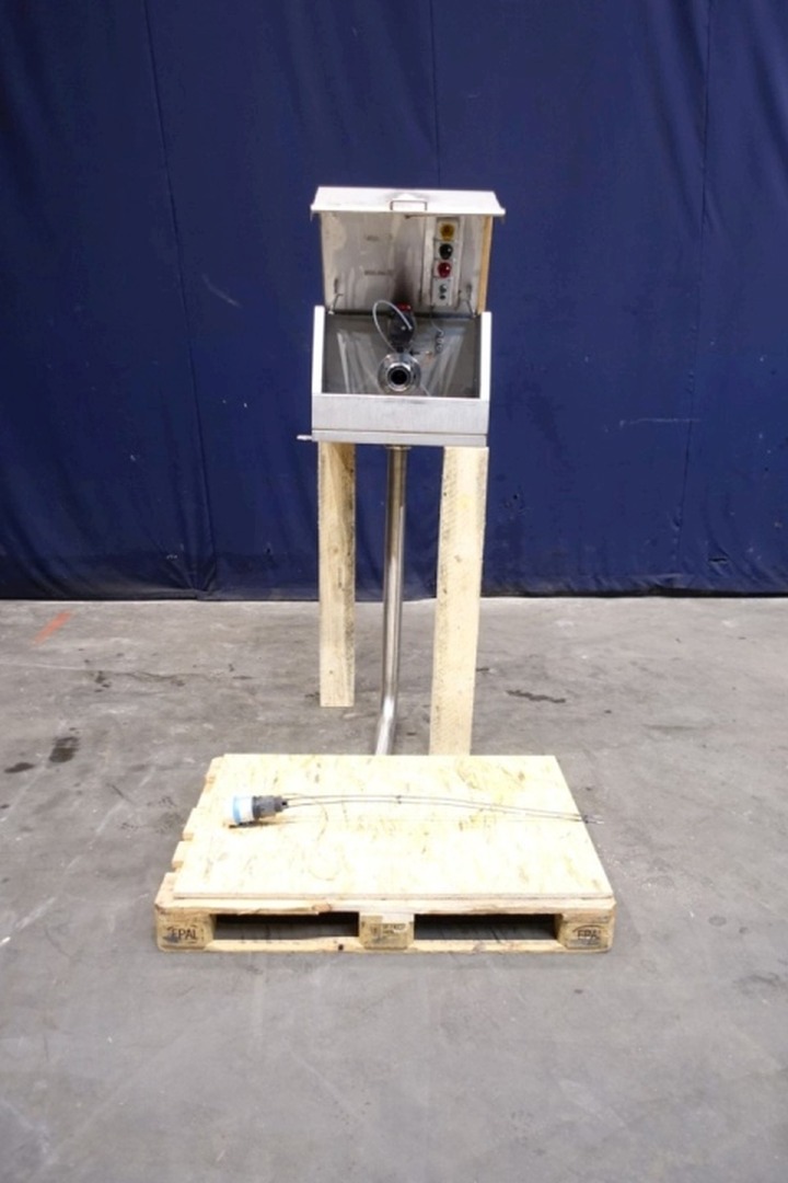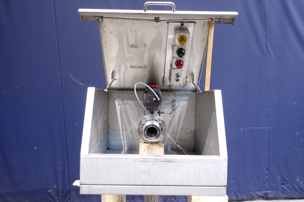 Reception unit for lye or acid or other chemicals delivered by truck. Outside mounted to pump chemicals to a tank.