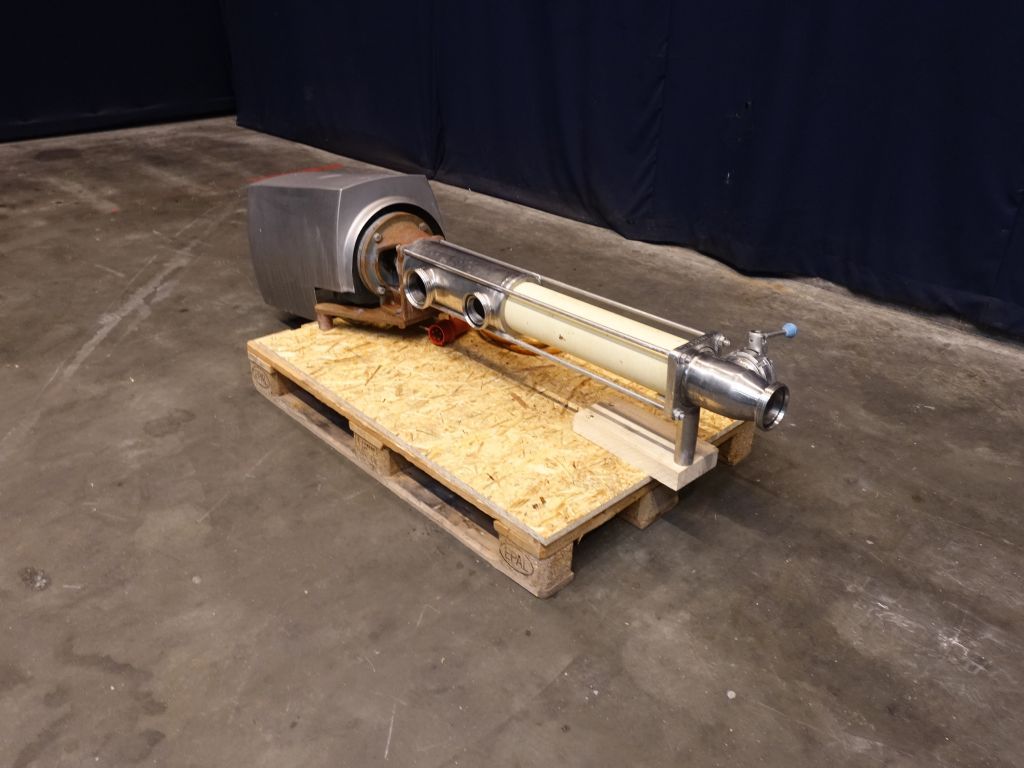 Mono pump. Stator diameter 120 mm. Stator length 500 mm. Current motor: 5,5 kW - 11,4 A - n1 1445 rpm - i = 8,5 - n2 = 170 rpm. Stainless steel cover over electric motor. Frame mounted. Connections: DN80/DN50, DIN. Has been running as outfeed pump of a Westfalia KDA30 quark separator.
