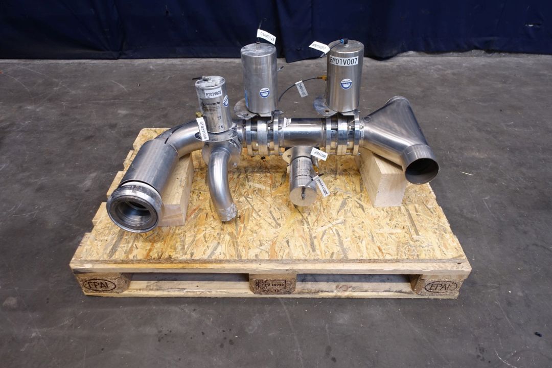 1x Trouser piece, 100 mm. 4x pneumatic valves, 2x DN100 + 2x DN65. Outlet 1x DN100 SMS.