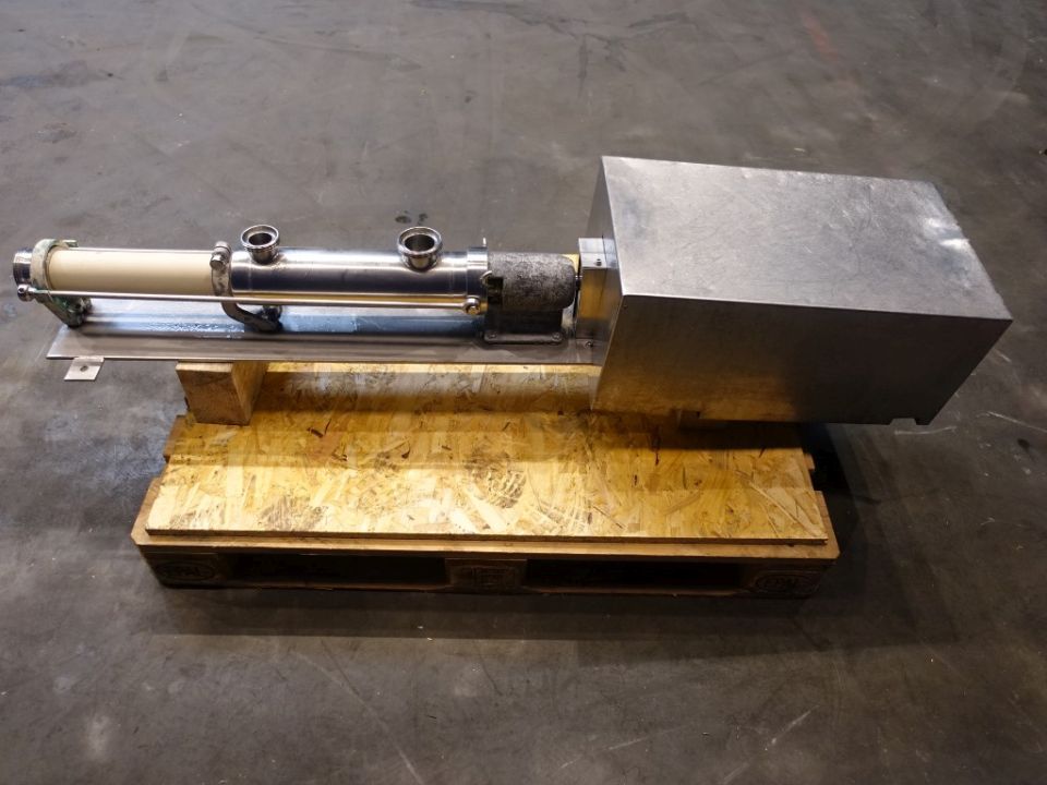 Stator diameter 30 mm, stator length 30 cm. Pressure: up to 12 bar. Connections: in: 2'', out: 2'' DIN. Current motor: 1,1 kW, n1: 1410 rpm, n2 = pump speed 112 rpm. Stainless steel cover over electric motor. Frame mounted.