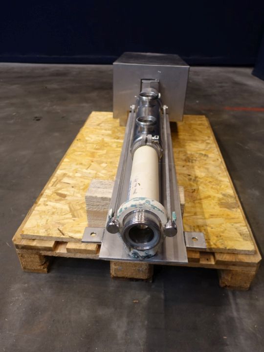 Stator diameter 30 mm, stator length 30 cm. Pressure: up to 12 bar. Connections: in: 2'', out: 2'' DIN. Current motor: 1,1 kW, n1: 1410 rpm, n2 = pump speed 112 rpm. Stainless steel cover over electric motor. Frame mounted.