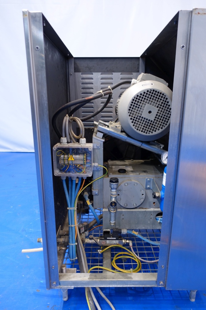 High pressure homogeniser. 3 Pistons, 1 stage, with manual pressure control. Pistons, pisotn diameter 30 mm and stroke: ca. 55 mm. Stainless steel cladded. Current motor power: 6,0 kW - 12 A - 50 hz - 400 V - 3 phase. Maximum pressure in current configuration with this motor up to 250bar. Free standing control panel (to be wall mounted). Operating hours on meter: 1.202. Including electronic pressur transmitter on inlet, pressure indicator manometer, overpressure valve, flowswitch (and manual valve) on cooling water. Total dimensions: 103x85x114 (lxwxh) cm - weight: 440 kg.