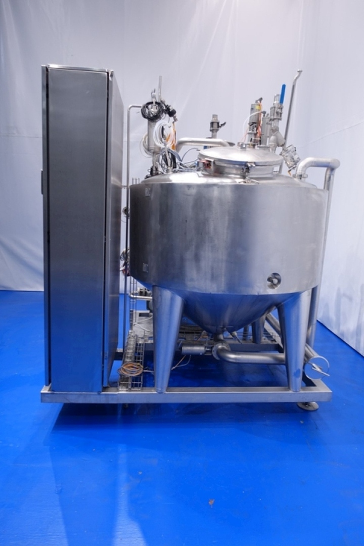 Skid mounted CIP unit which consists of: Tank, tubular heat exchanger and Centrifugal pump. Double jacketed SS tank capacity 1.000 ltrs. - with level sensors on 300/600/900ltr - Temperature sensor, Breather and round manhole in top, spray bowl. Tubular heat exchanger on outlet to heat the cleaing detergent make: IGEFA- type: 203-220-26-900-18 - built in 1991 - no. 29339 - heating surface 2,9 m2 - capacity 17/21 ltrs. - tube length 110 cm - tube head Ø 21 cm - 52 pipes Ø 16,5 mm. Centrifugal pump make: Wiking- 5,5 kW - 11 A - 50 Hz - 2.885 rpm - impellor Ø 175 mm - connections in: DN80 Din - out: DN65 Din. Controls Siemens Simatic. Total dimensions: 230x212x273 (lxwxh) cm - weight: 1.158 kg's. Documentation: PID available.