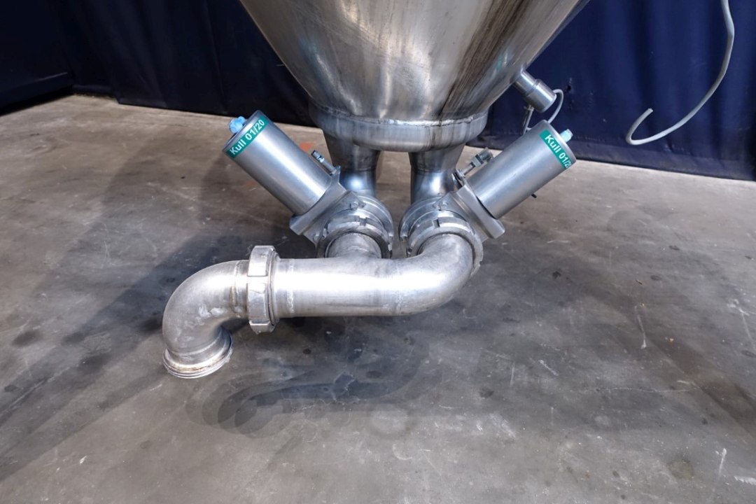Vertical Quark silo, stark conical for viscose products (like freshcheese/quark), single jacketed. Product outlet by (2 outlets 3" each) with pneumatic butterfly. 2 level sensor and 1 temp, sensor. 2 CIP spray bowl(s). connection for sterile air, Manhole in top, round . 3 Adjustable feet. Inside dimensions of tank: Ø 200cm Total dimensions: 2,3 x h: 3,3 meter.