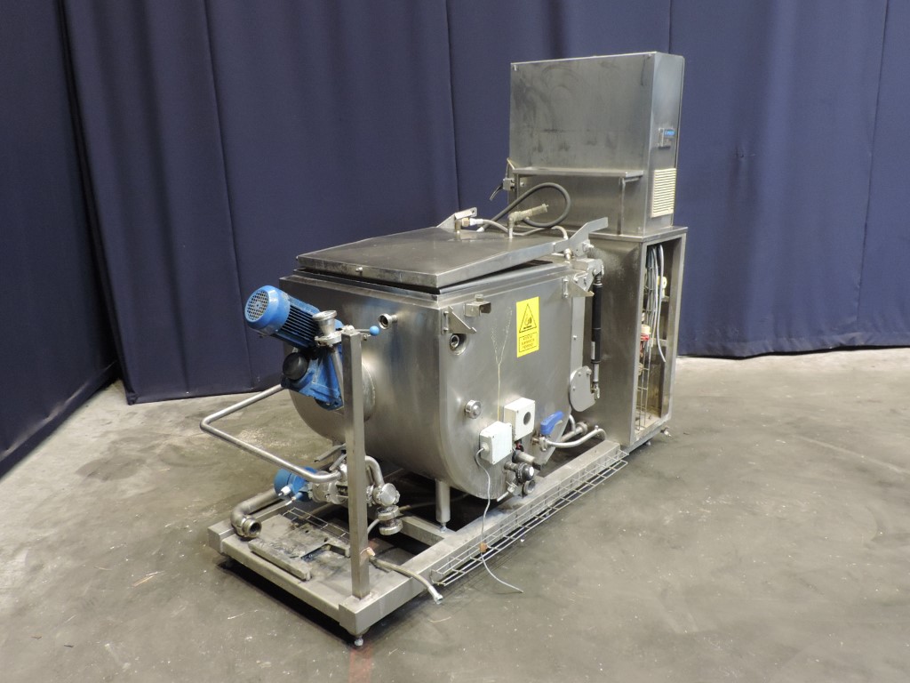 Skidmounted butter or blocks of vegetable fat melting unit including tank (double jacketed) with heated grid and top plate. The blocks are placed on the heated grid and melted. The liquid drops on a plate and afterwards in the collecting tank. The tank has a propellor agitator (motor 0,55 kW) in liquid fat (so also for vegetable fat suitable), cover, LLS and Temperature Transmitter. Electric heating system and hot water circulation pump, Control panel with Siemens S7-200 PLC, Siemens Simatic Touch screen opertor panel and Jumo registration unit. Project number: 02/01855. Total dimensions: 220 x 110 x 190 cm.
