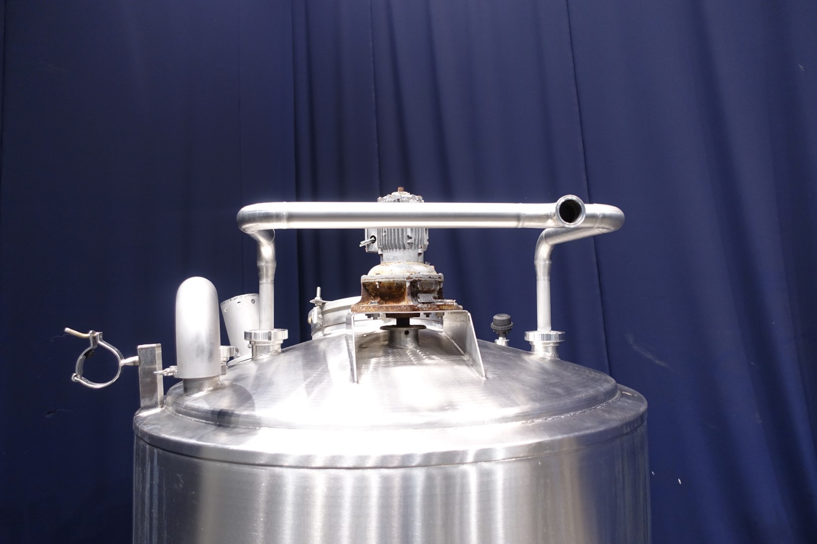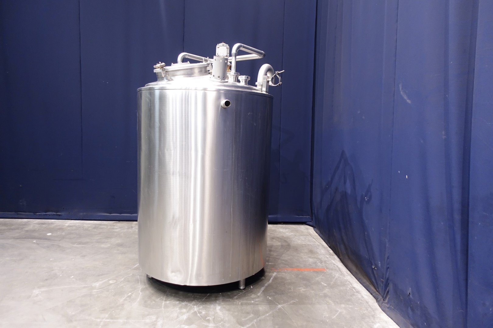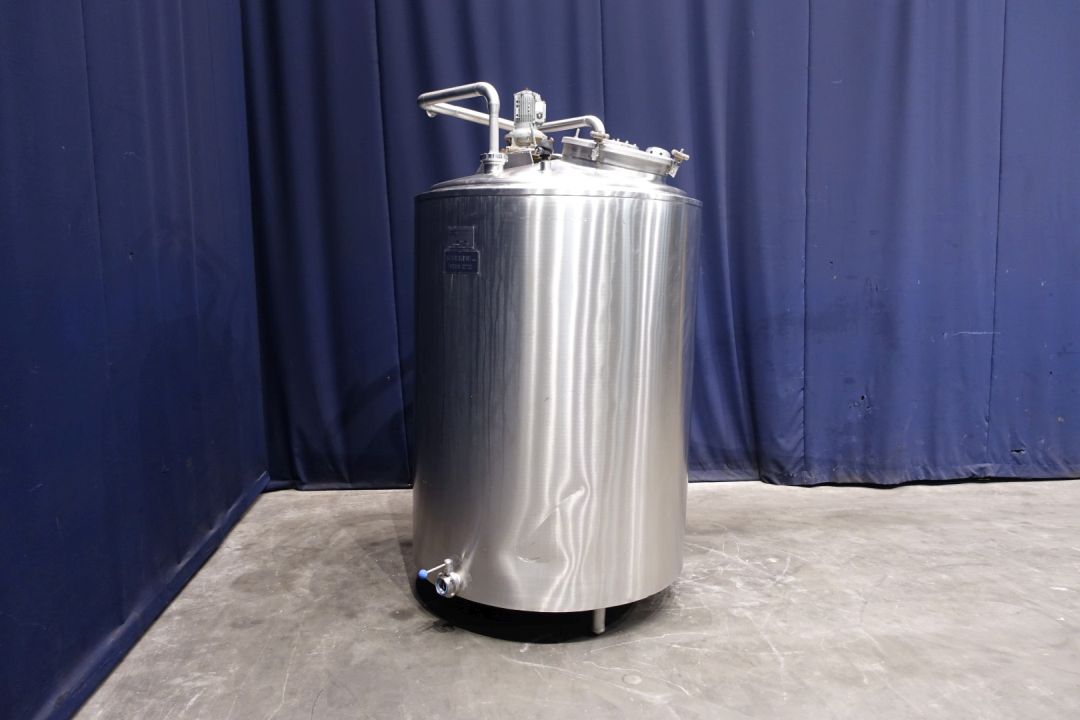 Double jacketed process tank. Topside driven blade agitator, shaft with two paddle blades. Motor power: 0,37 kW - n1: 1360 rpm - i - agitator speed n2: 72 rpm. Product outlet with manual butterfly valve 2" DIN and outlet height: 20 cm. 1 x Temperature sensor. Breather 180° bent pipe. 2 CIP spray bowls, one high and one low, Cip connection 2 x 3" DIN bypas to 1 x 2" tryclamp. Input pipe on top 1 x 2,5" Din. Manhole in top, round, diameter 44,5 cm. Sightglass in manhole lid. Lamp on top of tank. 3 Adjustable feet. Inside dimensions of tank: Ø 110 cm and height 160 cm. Total outer dimensions: 130 x 130 x 230 cm.