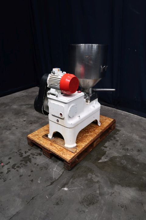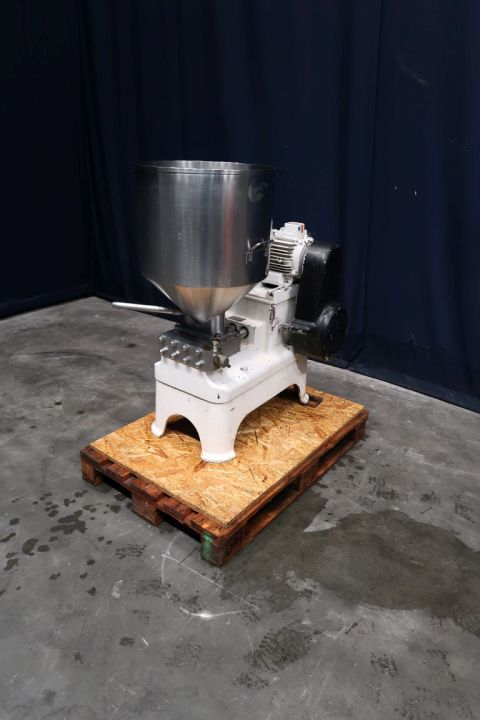 Special Quark smoothing homogeniser, with obturator housing, special screw typ homogenising head, available can be changed on request for more or less moother result, 3 pistons, piston diameter 40 mm. Connections: input hopper, volume: 80 ltr. Motor power: 4 KW working pressure 85 bar.